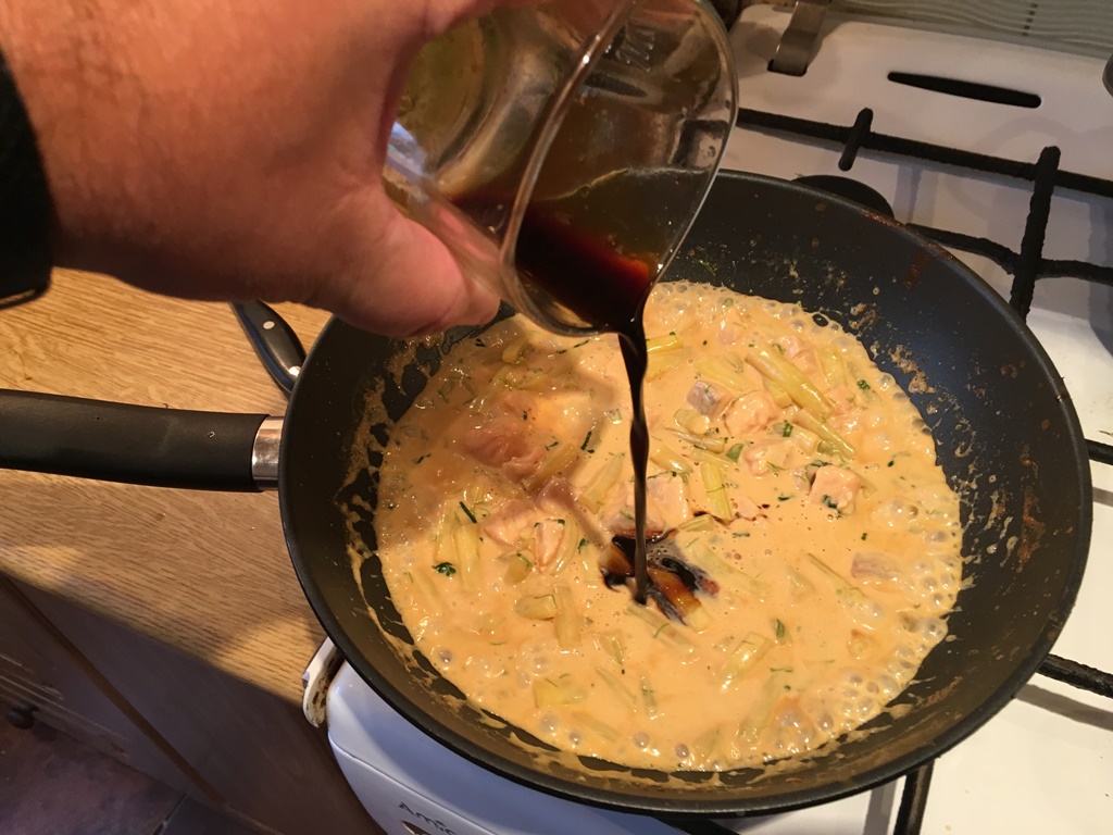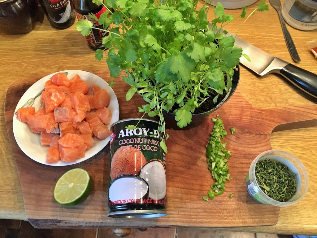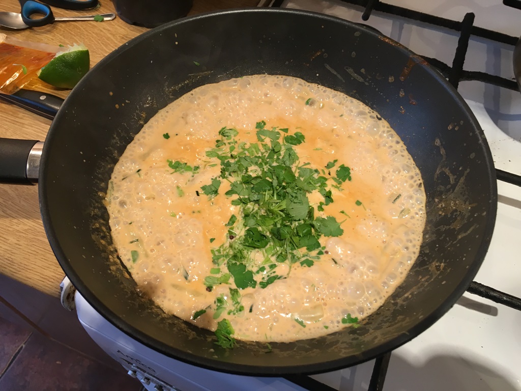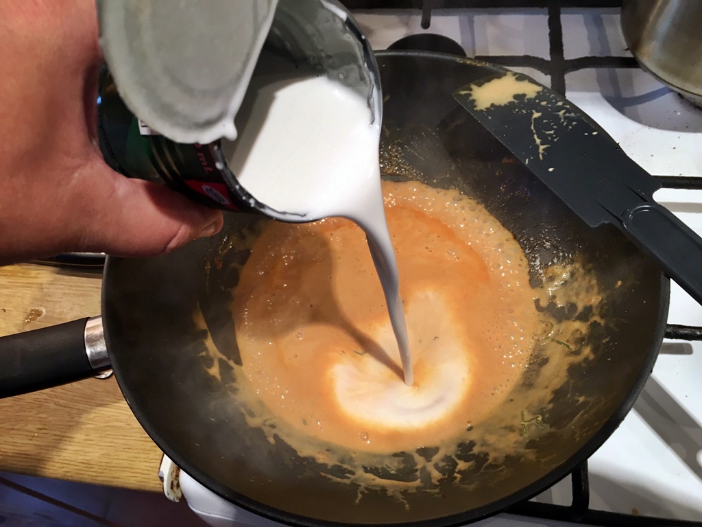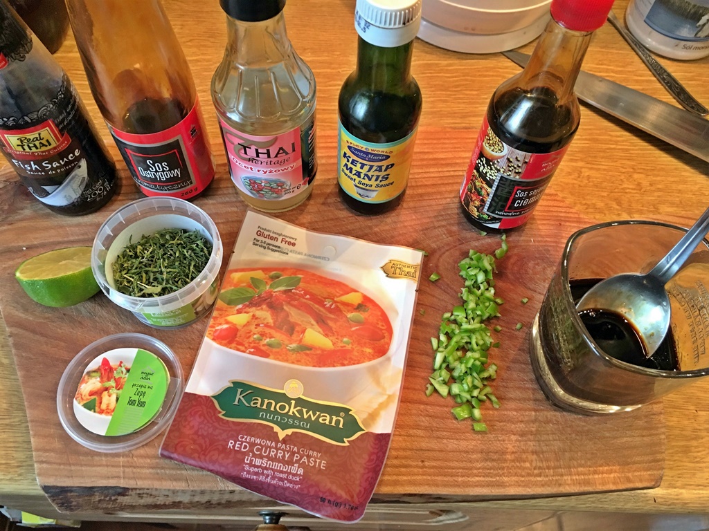 Baza sosu: 1 puszka mleczka kokosowego, 1 łyżeczka czerwonej pasty curry.