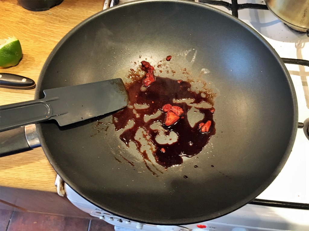 Baza w woku: Wlej do woka 2 łyżki sosu sojowego lub rybnego, dodaj pastę curry, a następnie podgrzewaj powoli, aż pasta się rozpuści i uwolni aromat.
