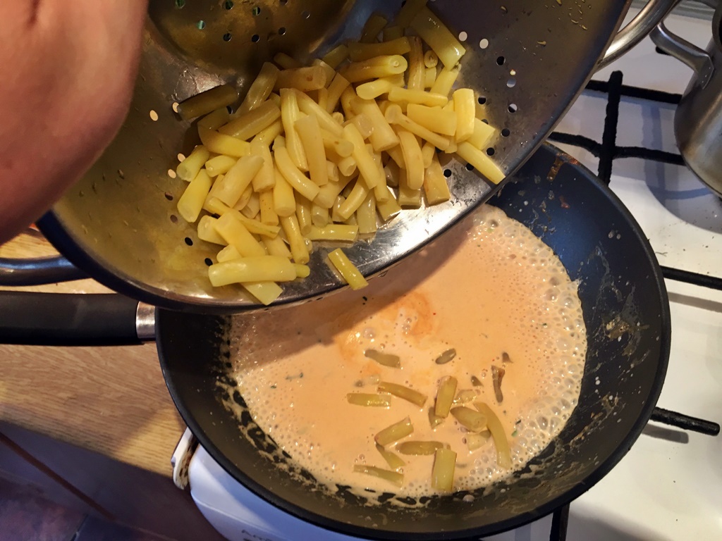 Fasolka: Wrzuć na patelnię fasolkę szparagową i gotuj na średnim ogniu kilka minut, aż sos wyraźnie zgęstnieje, a fasolka zmięknie.