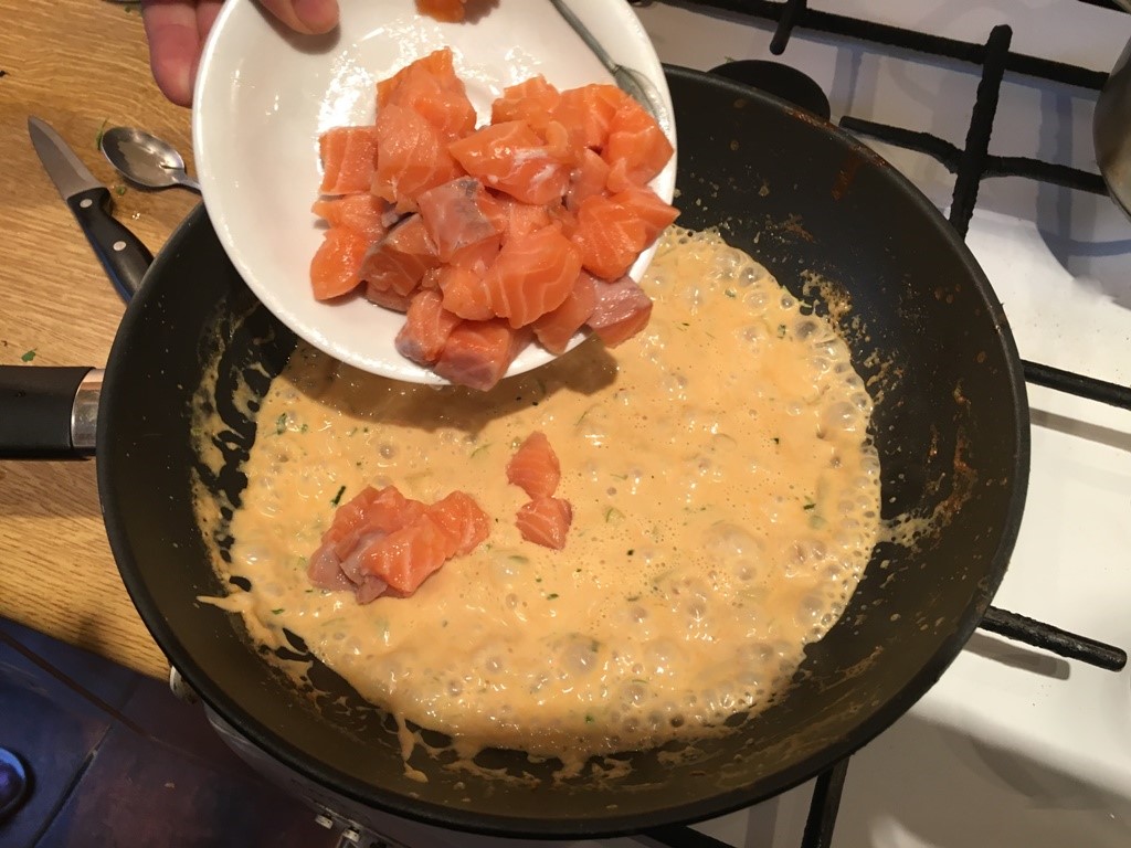 Wykończenie: Dodaj większość pęczka kolendry, sok z drugiej limonki, pokrojonego łososia oraz wcześniej przygotowany sos z miseczki. Następnie wyłącz gaz pod wokiem (ciepło sosu wystarczy, by łosoś doszedł).