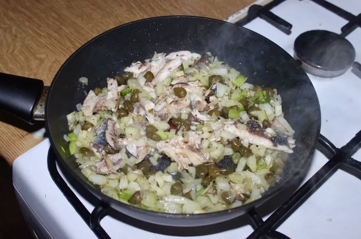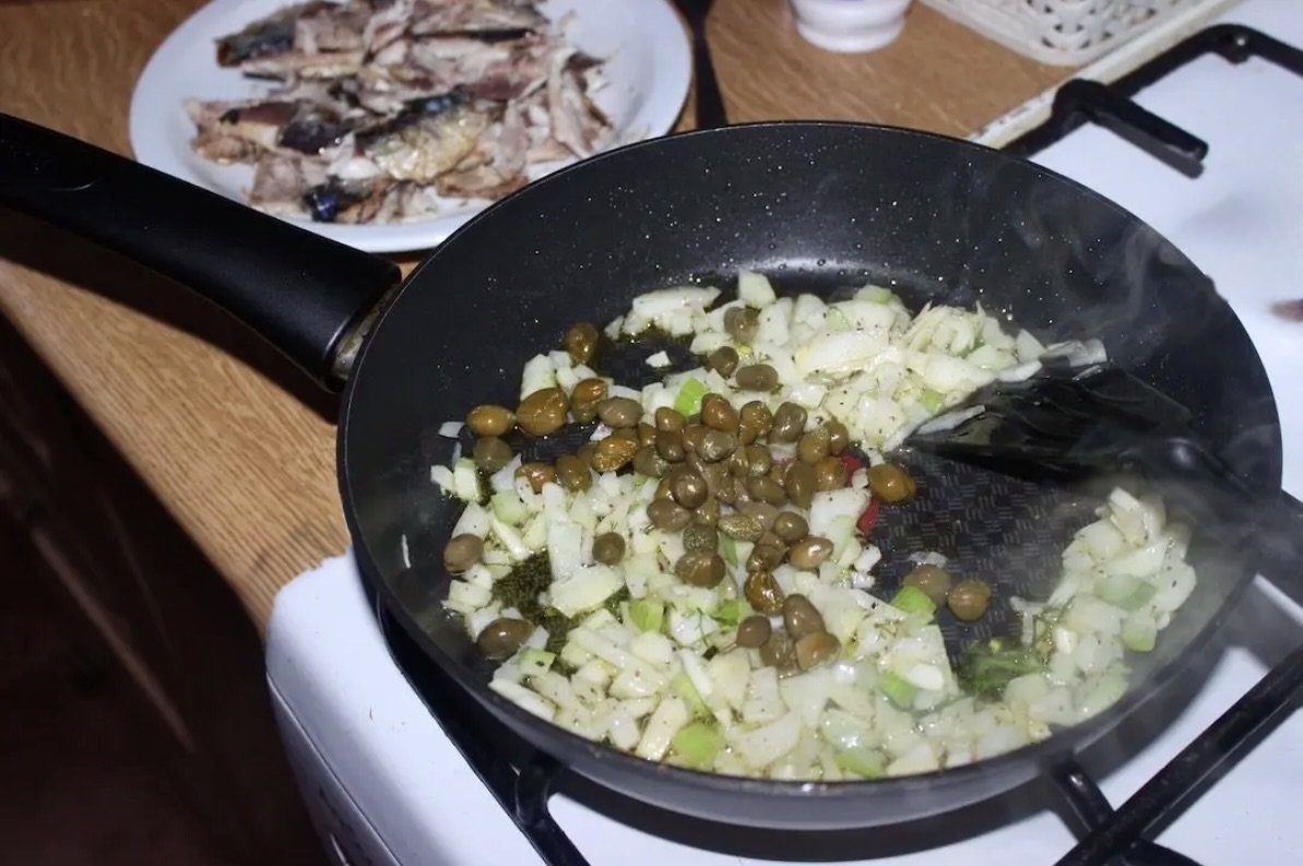 Wyłącz gaz, dodaj przygotowane wcześniej kawałki sardynek i posyp pieprzem. Delikatnie wymieszaj, aby ryba tylko się ogrzała, ale nie rozpadła.