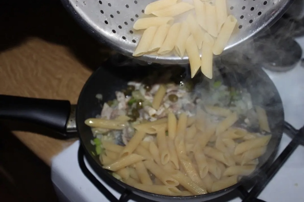 Odcedzony makaron wrzuć na patelnię z rybą i fenkułem. Delikatnie połącz składniki.
