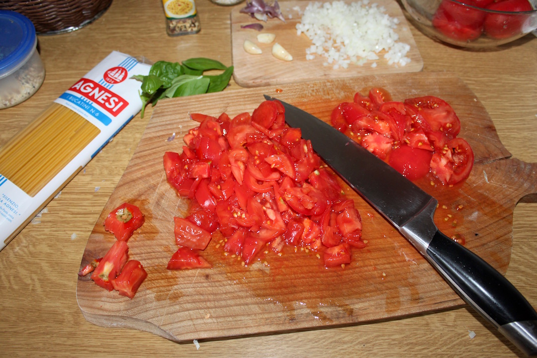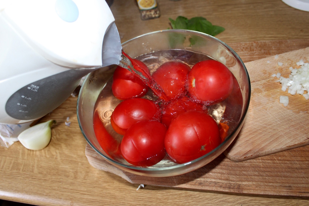 Przygotowanie pomidorów: Pomidory zalej wrzątkiem na 2 minuty, następnie przelej zimną wodą i zdejmij z nich skórkę. Pokrój je w niedużą kostkę.