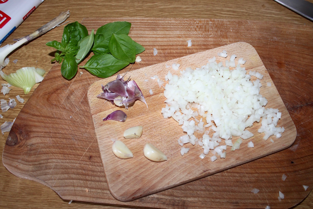Zioła i przyprawy: garść świeżych liści bazylii, suszone płatki chilli (lub peperoncino), sól, pieprz.