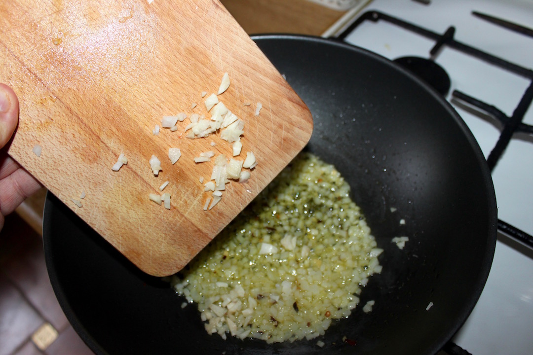 Baza sosu: Cebulę i czosnek drobno posiekaj. Na patelni rozgrzej oliwę, zeszklij cebulę wraz z płatkami chilli. Dodaj czosnek i smaż przez około pół minuty.