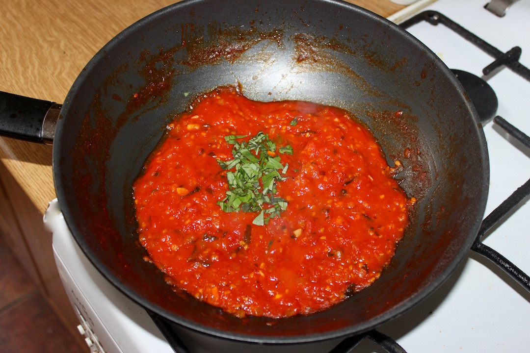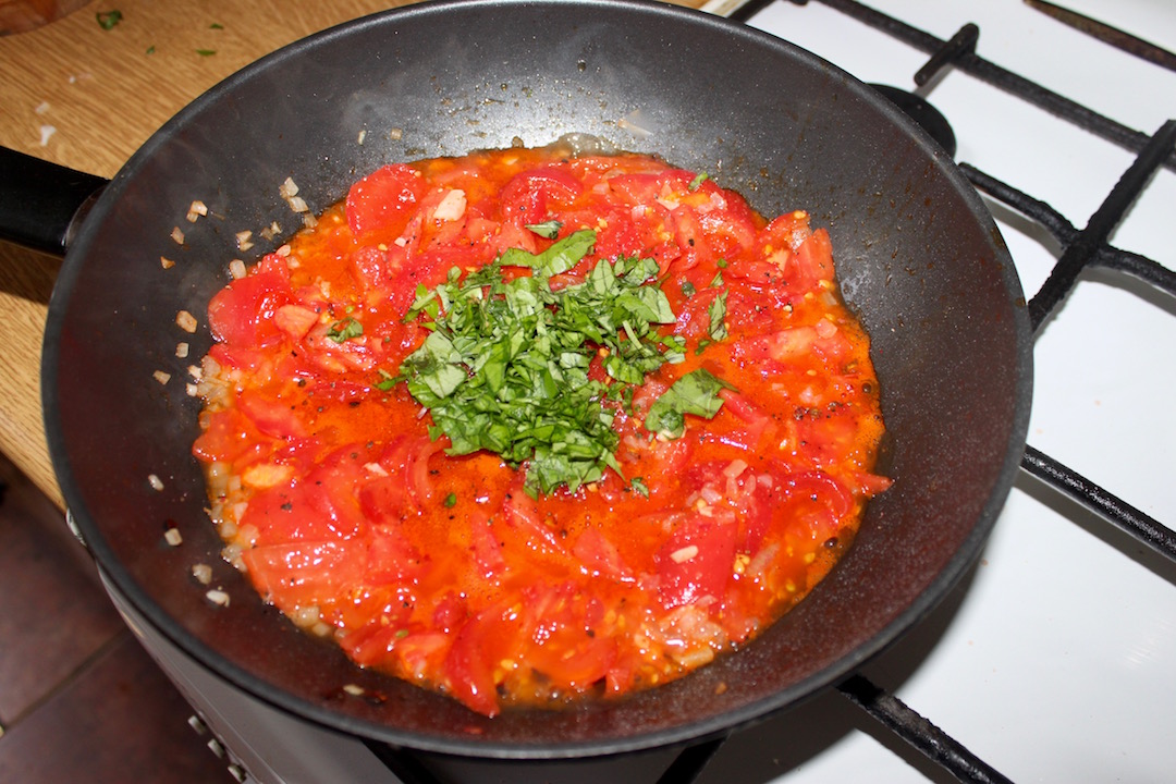 Gotowanie sosu: Na patelnię wrzuć pokrojone pomidory oraz garść porwanych liści bazylii. Dopraw solą. Zmniejsz ogień do minimum i duś przez około 30 minut, aż sos zgęstnieje, a woda odparuje (zobacz dokładny przepis na domowy sos pomidorowy).