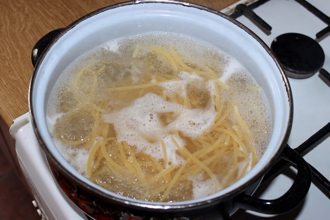 Gotowanie makaronu: W międzyczasie ugotuj makaron w osolonej wodzie na sposób al dente.