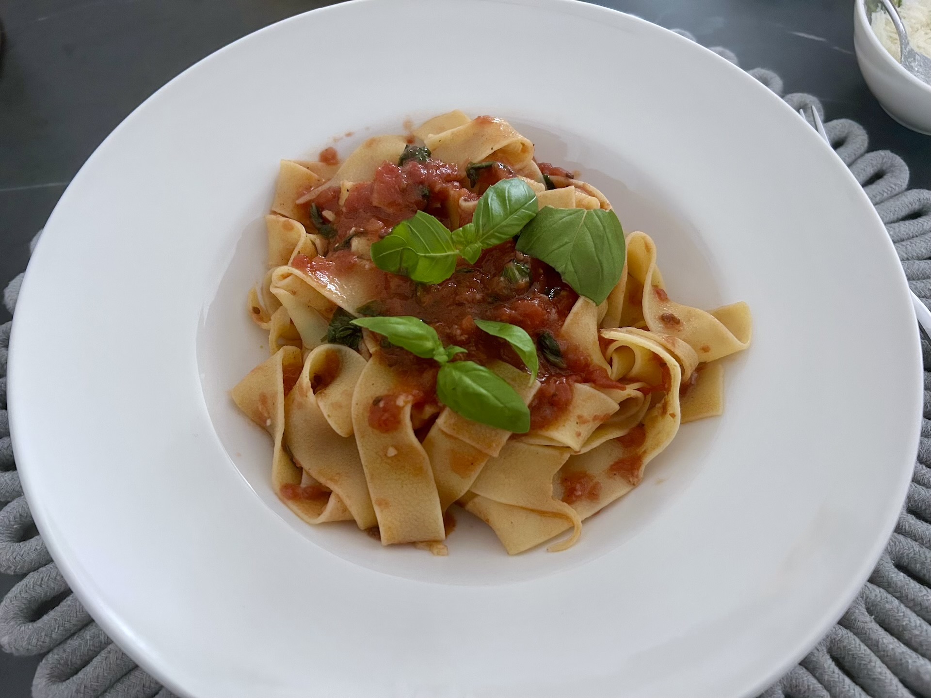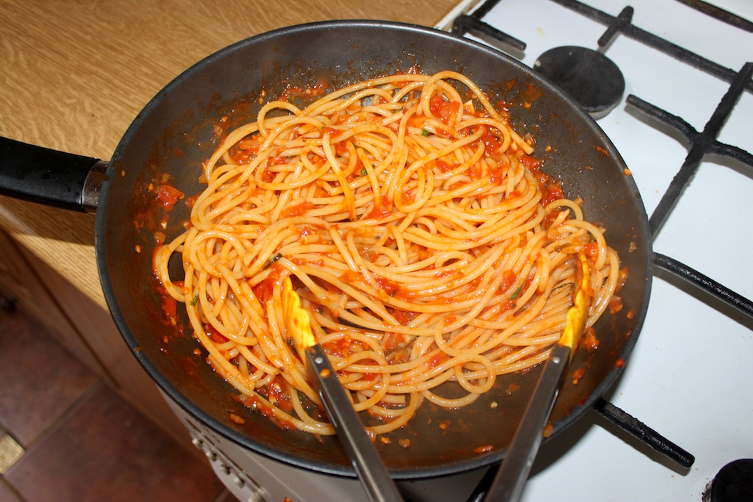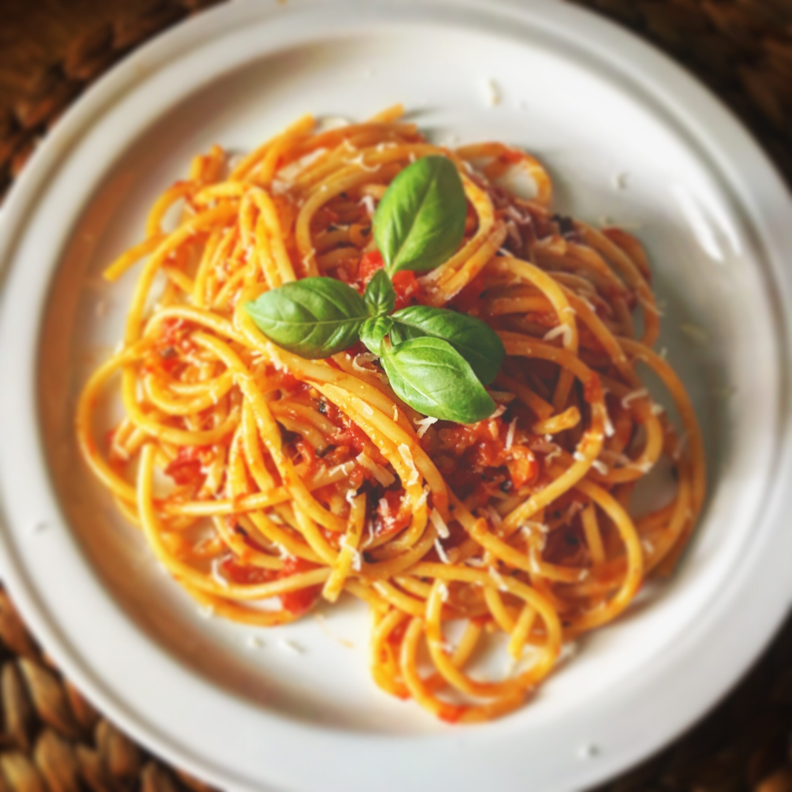 Makaron z sosem pomidorowym to obowiązkowa pozycja latem. To właśnie wtedy pojawiają się dojrzałe, skąpane w słońcu pomidory, które mają smak doskonały i słodki. Do tego dania zawsze polecam makaron spaghetti albo bucatini, czyli takie grubsze spaghetti z dziurką w środku. Z dziurką po to, aby makaron równomiernie się ugotował. Sam sos pomidorowy przygotowuje się banalnie, choć trzeba poświęcić mu kilkadziesiąt minut, aby go dopieścić. Za to odwdzięczy Ci się po dwakroć. Zachęcam do wypróbowania mojej wersji tego popularnego dania.