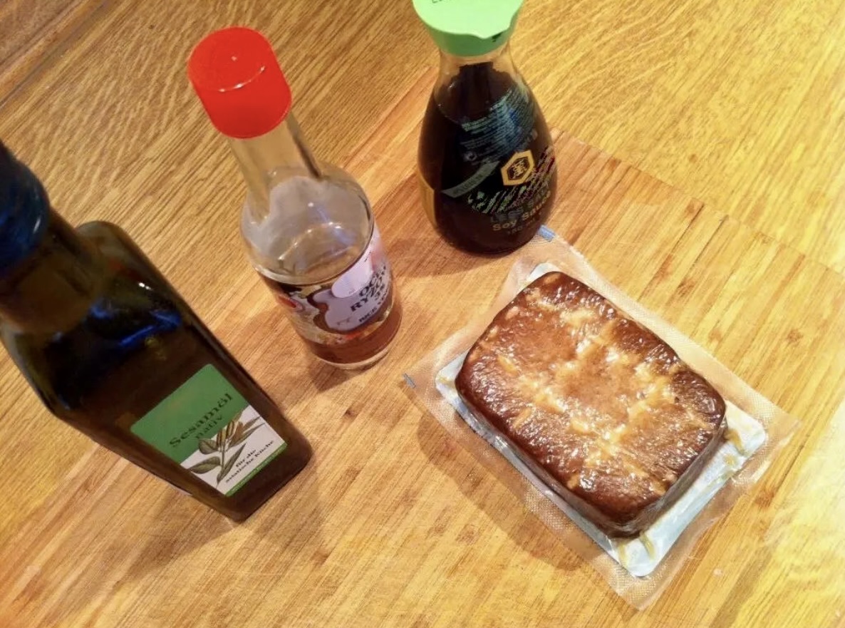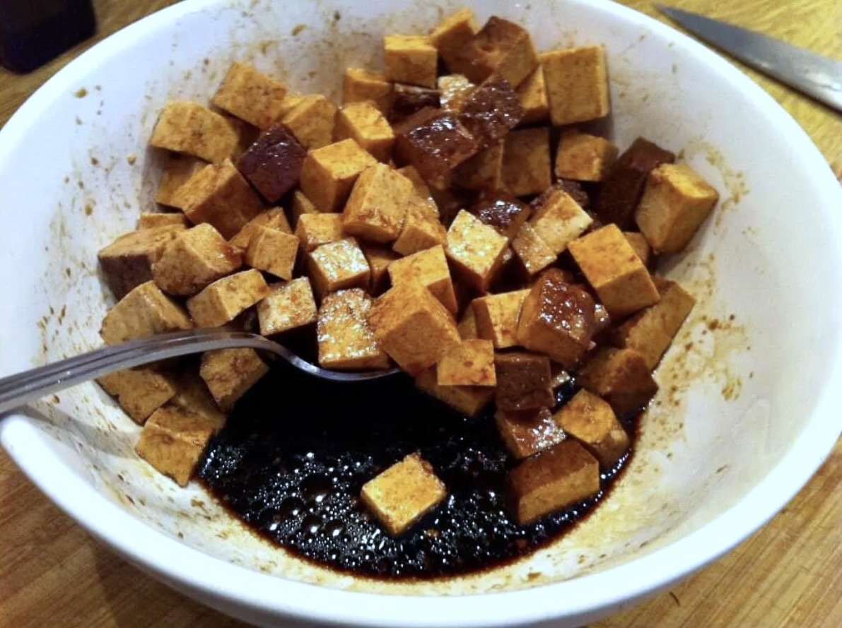 Marynata do tofu: Wymieszaj sos sojowy, olej sezamowy i ocet ryżowy w zbalansowanych proporcjach. Tofu pokrój w 1 cm kostkę i marynuj w sosie minimum pół godziny.