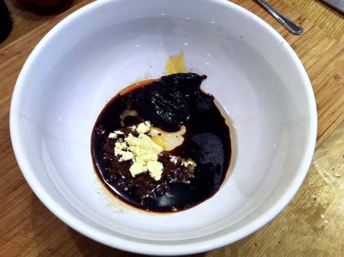Sos do dania: Wymieszaj sos sojowy (3 łyżki), olej sezamowy (1 łyżeczka), mąkę kukurydzianą (1 łyżka), słodką pastę curry (1 łyżka) i ocet ryżowy (1 łyżka). Dolej około 150 ml bulionu warzywnego i odstaw.