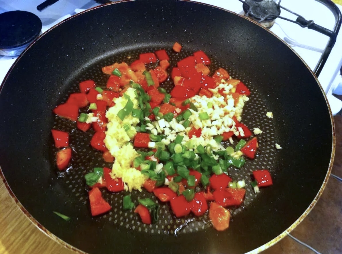 Warzywa/Aromaty: 1 dymka, kawałek świeżego imbiru, 3-4 ząbki czosnku, 1 mała czerwona papryka.