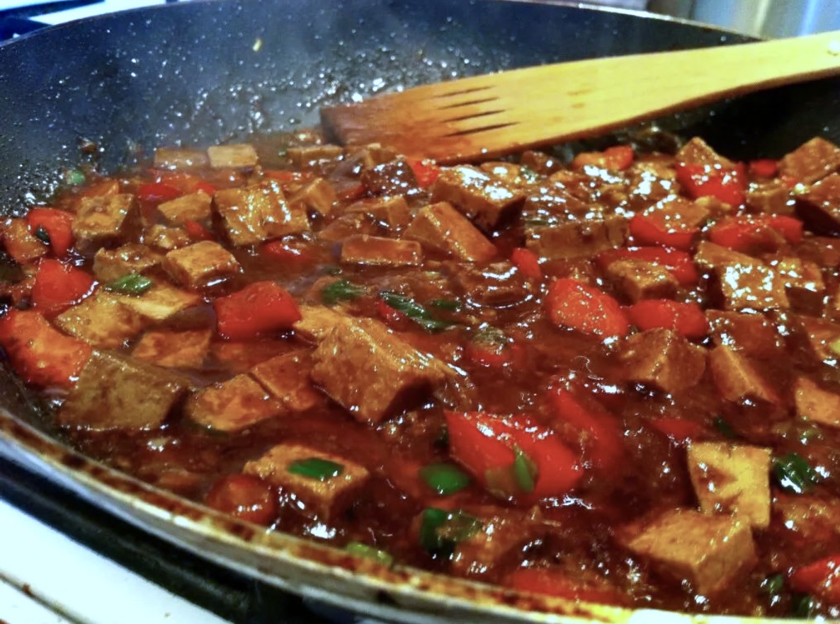 Wrzuć tofu wraz z marynatą, wlej przygotowany sos, zamieszaj i duś na małym ogniu około 2 minuty, aż sos zgęstnieje.