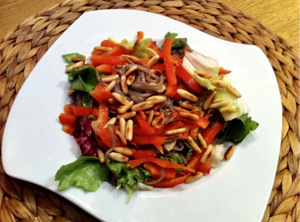 Makaron z tofu w poniżej przedstawionej wersji to danie o specyficznym smaku, które nie wszystkim „podejdzie”. Kto jednak lubi smaki Azji i zdecydowane smaki w ogóle z pewnością powinien dostrzec w nim same pozytywy. Mnie bardzo smakowało szczególnie, że głównym obok tofu składnikiem jest pyszny makaron gryczany soba. Orzeszki piniowe, jeżeli nie możesz sobie na nie pozwolić możesz zastąpić np. arachidowymi. Ostateczny smak marynaty i sosu zawsze zależy od Ciebie, moje proporcje traktuj jako propozycję.