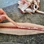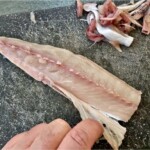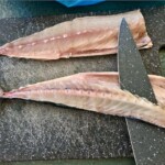 Przygotowanie makreli: Odetnij głowę ryby. Ostrym nożem natnij makrelę wzdłuż kręgosłupa od strony głowy do ogona, prowadząc nóż blisko kości, aby wyciąć filet. Analogicznie wytnij drugiego fileta. Usuń duże ości prowadząc nóż płasko od środka ryby w kierunku brzucha, a także usuń wzdłużną tkankę kostną od strony grzbietu. Aby usunąć małe ości przy kręgosłupie, natnij mięso ukośnie po obu stronach miejsca po kręgosłupie i usuń ości (dowiedz się, jak rozpoznać świeże ryby).