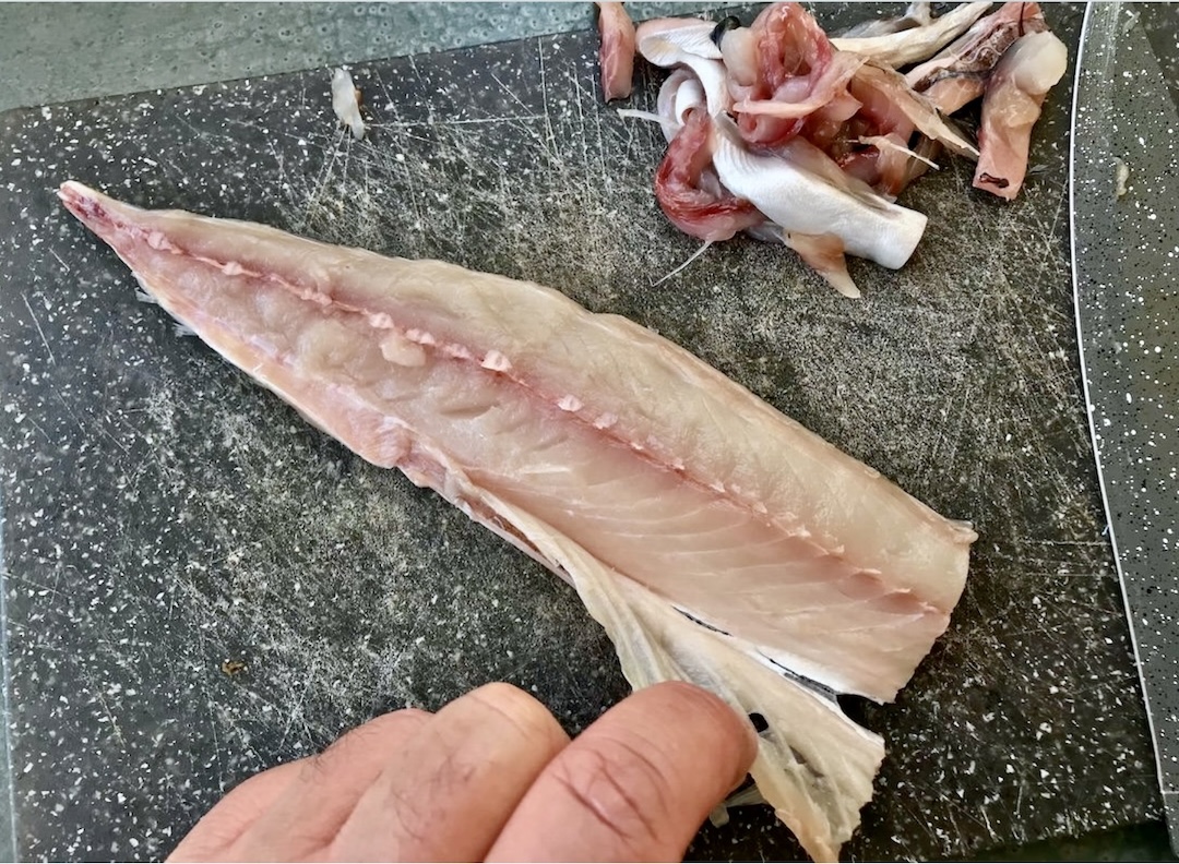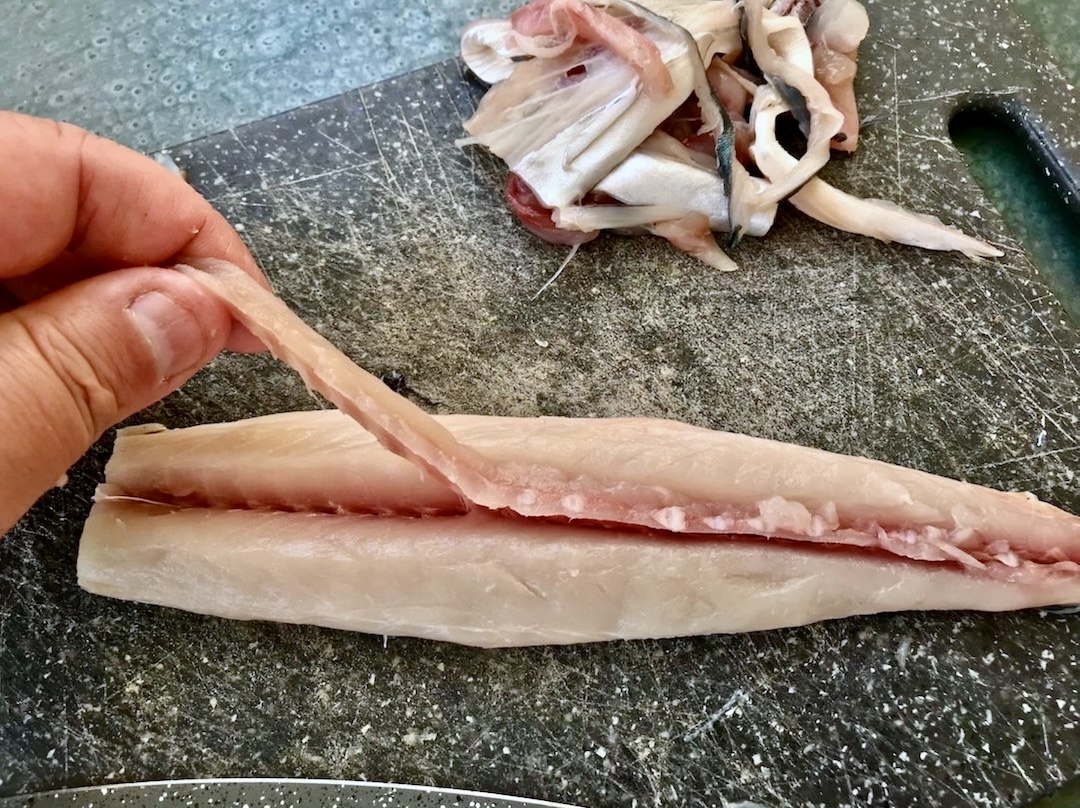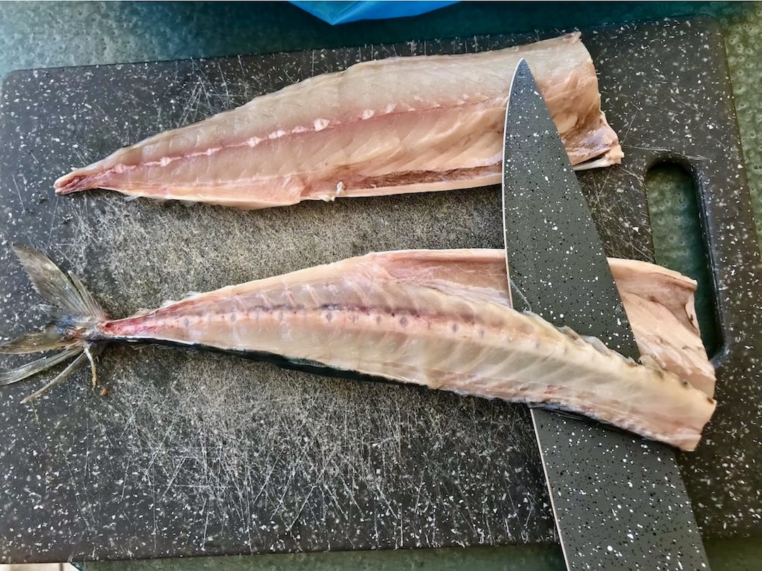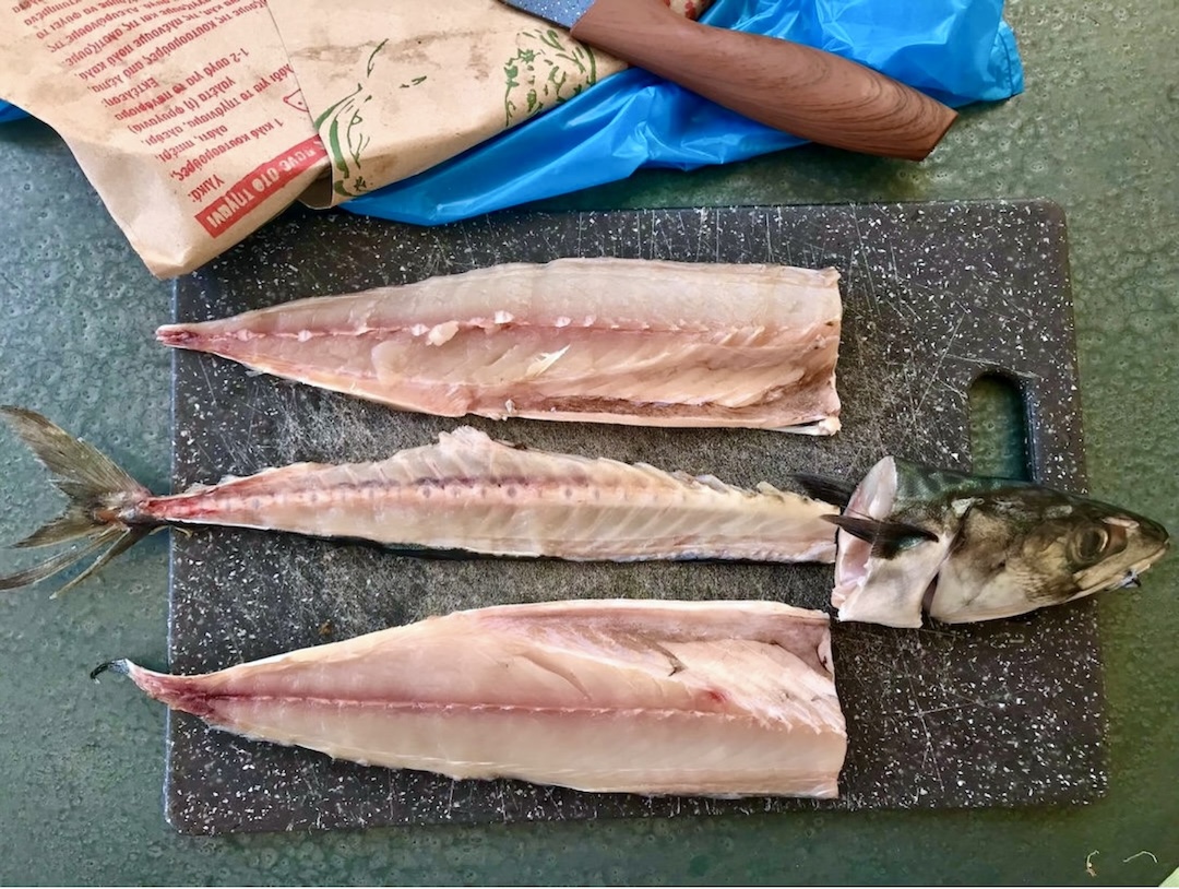 Przygotowanie makreli: Odetnij głowę ryby. Ostrym nożem natnij makrelę wzdłuż kręgosłupa od strony głowy do ogona, prowadząc nóż blisko kości, aby wyciąć filet. Analogicznie wytnij drugiego fileta. Usuń duże ości prowadząc nóż płasko od środka ryby w kierunku brzucha, a także usuń wzdłużną tkankę kostną od strony grzbietu. Aby usunąć małe ości przy kręgosłupie, natnij mięso ukośnie po obu stronach miejsca po kręgosłupie i usuń ości (dowiedz się, jak rozpoznać świeże ryby).