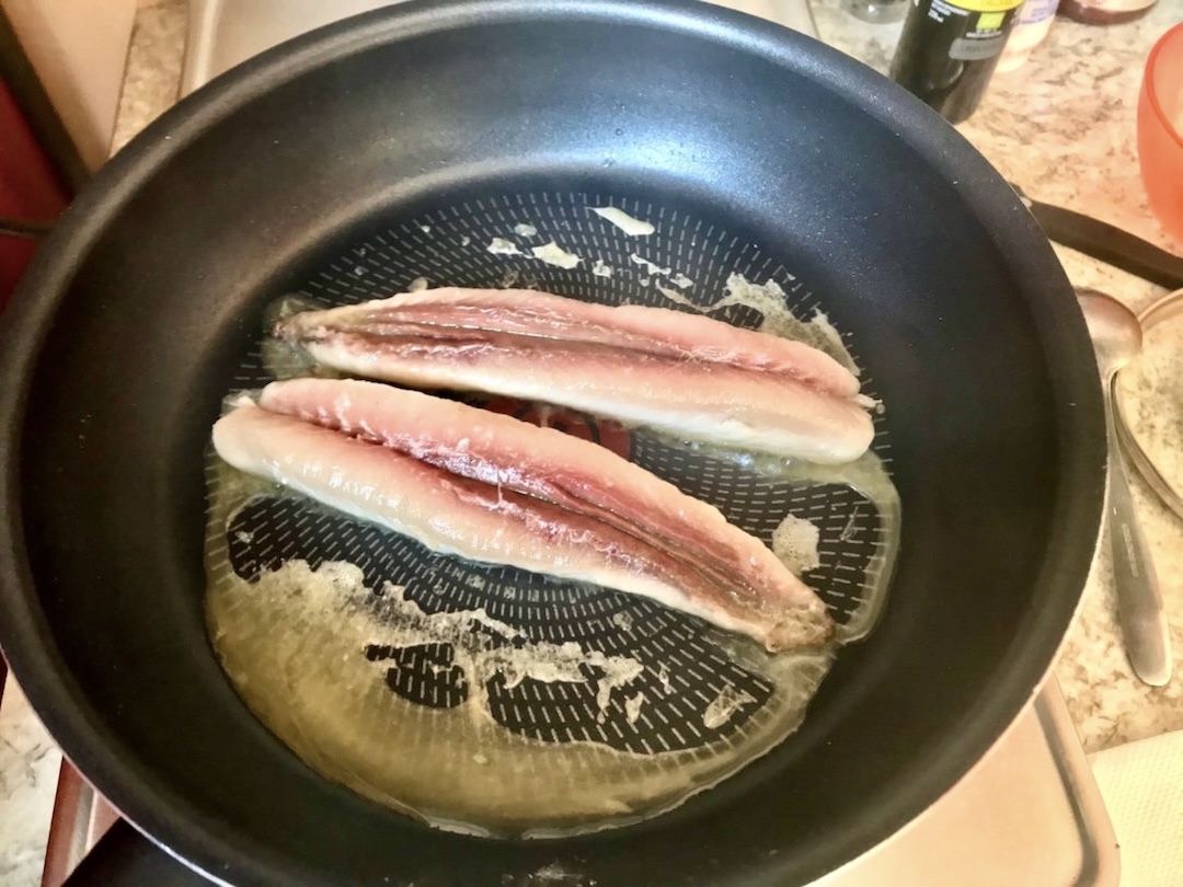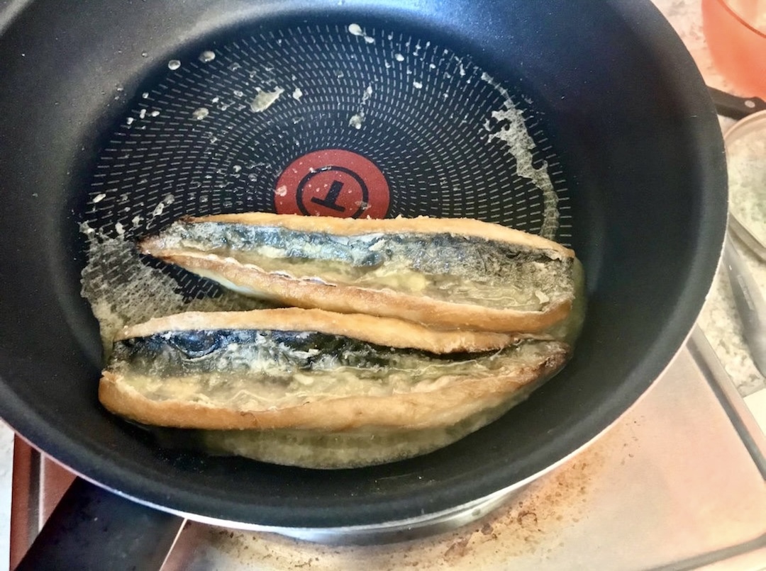 Smażenie makreli: Filety z makreli lekko posól, a następnie delikatnie obsyp mąką. Smaż makrelę na oliwie na średnim ogniu: