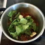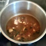 Duszenie główne: Przelej zawartość patelni do garnka. Dolej 200 ml gorącej wody, wrzuć ziele angielskie i liść laurowy. Duś mątwę z warzywami na wolnym ogniu pod przykryciem przez około 40 minut.