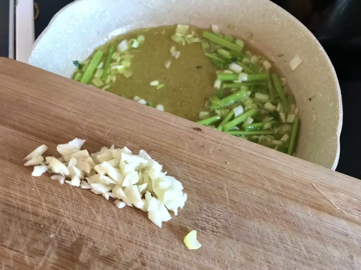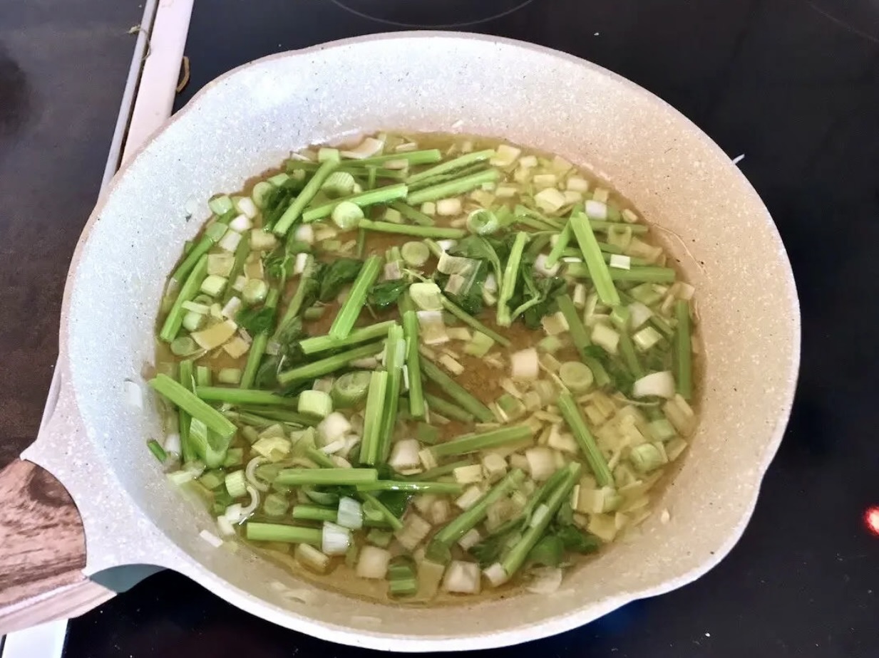 Smażenie warzyw: Na patelnię wlej około 100 ml oliwy. Na letnią oliwę wrzuć posiekane łodygi ziół oraz cebulę. Smaż warzywa na średnim ogniu przez 2 do 3 minut, aby nieco zmiękły. Uważaj, aby ich nie zrumienić. Wsyp posiekany czosnek i smaż wszystko jeszcze minutę.