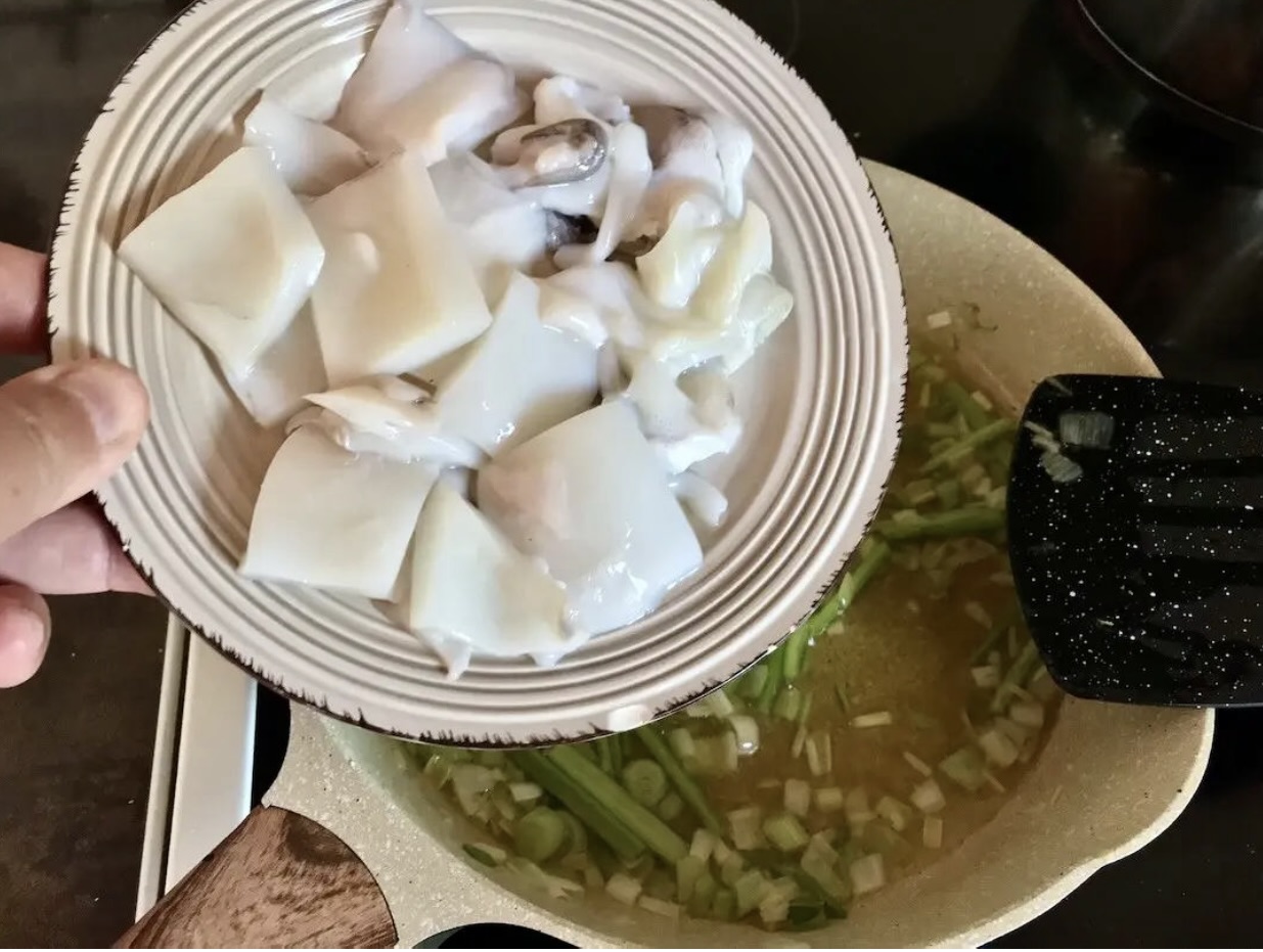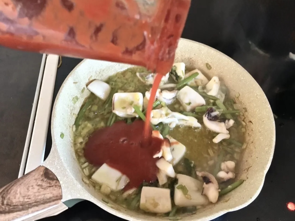 Duszenie mątwy (I etap): Oczyszczoną i dobrze osuszoną mątwę pokrój na spore kawałki, a następnie wrzuć na patelnię. Smaż całość 2 do 3 minut na średnim ogniu.