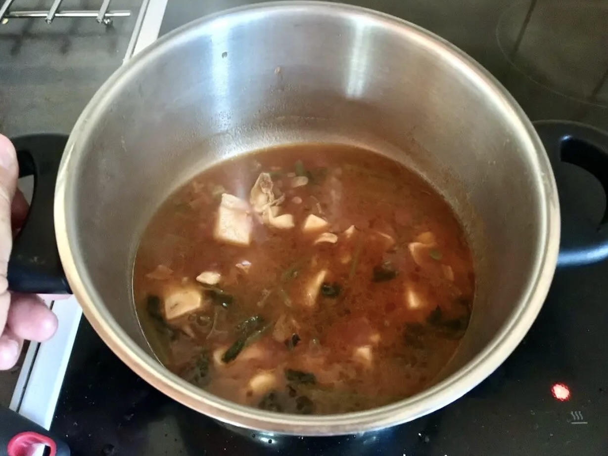 Dodanie pomidorów i wstępne duszenie: Zetrzyj 1 lub 2 pomidory (lub wlej około 200 ml przecieru pomidorowego) na patelnię. Duś całość na średnim ogniu 2 do 3 minut, delikatnie mieszając.