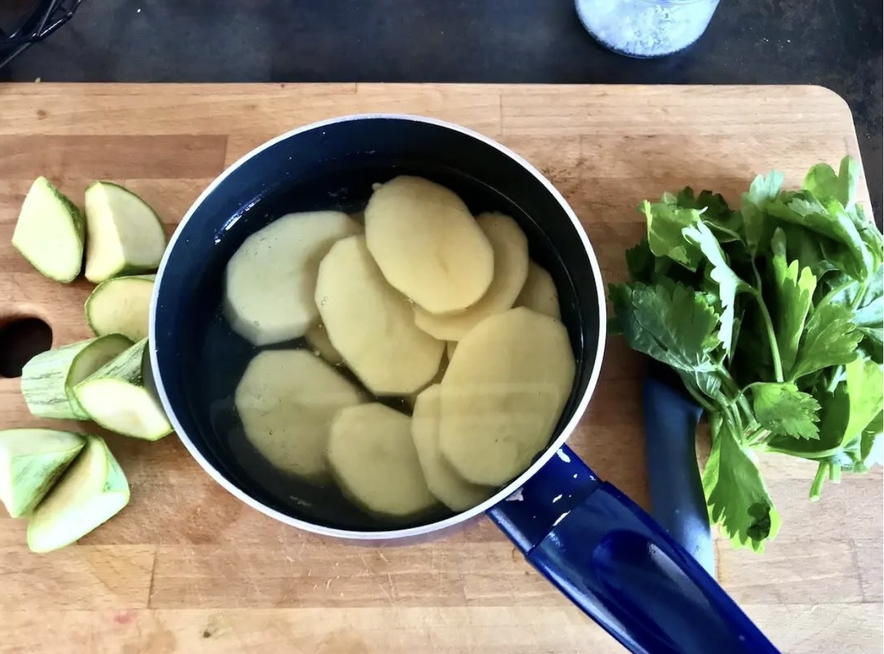 Przygotowanie dodatków: W międzyczasie obierz ziemniaki i pokrój na plastry grubości pół centymetra. Cukinię pokrój w grube kawałki. Przygotuj także liście ziół.