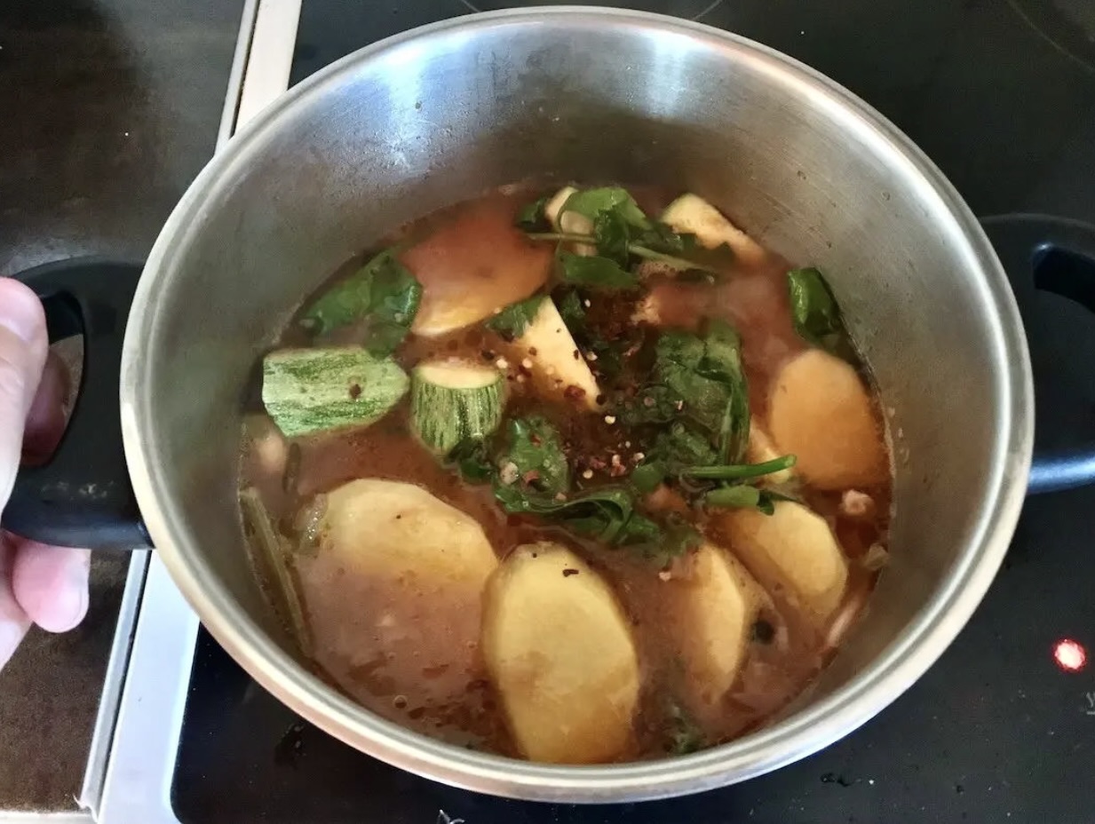 Duszenie z ziemniakami i cukinią: Gdy mątwa jest „al dente” (po ok. 40 minutach), wrzuć do garnka liście ziół, dodaj plastry ziemniaków oraz cukinię. W razie potrzeby dolej odrobinę gorącej wody.