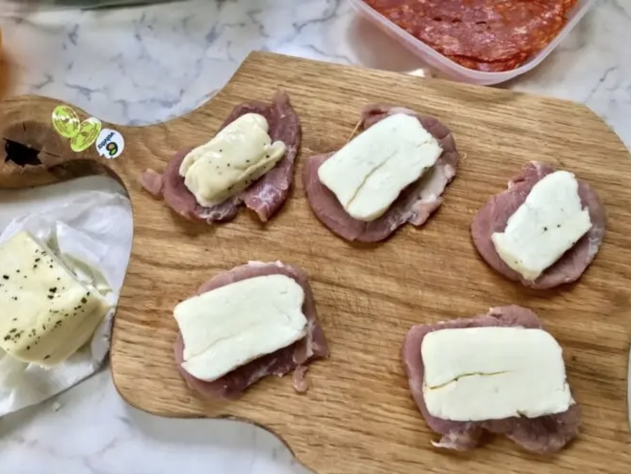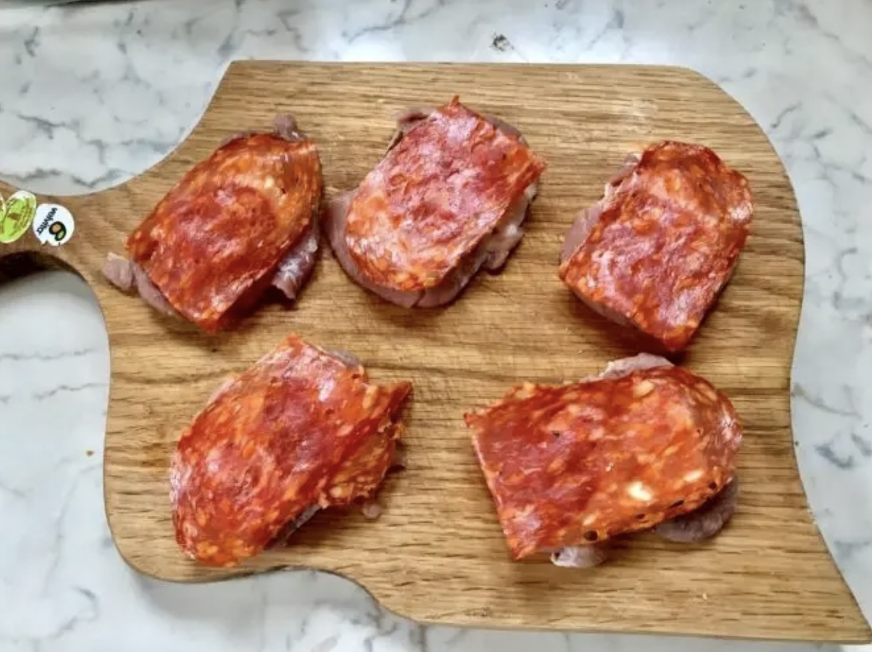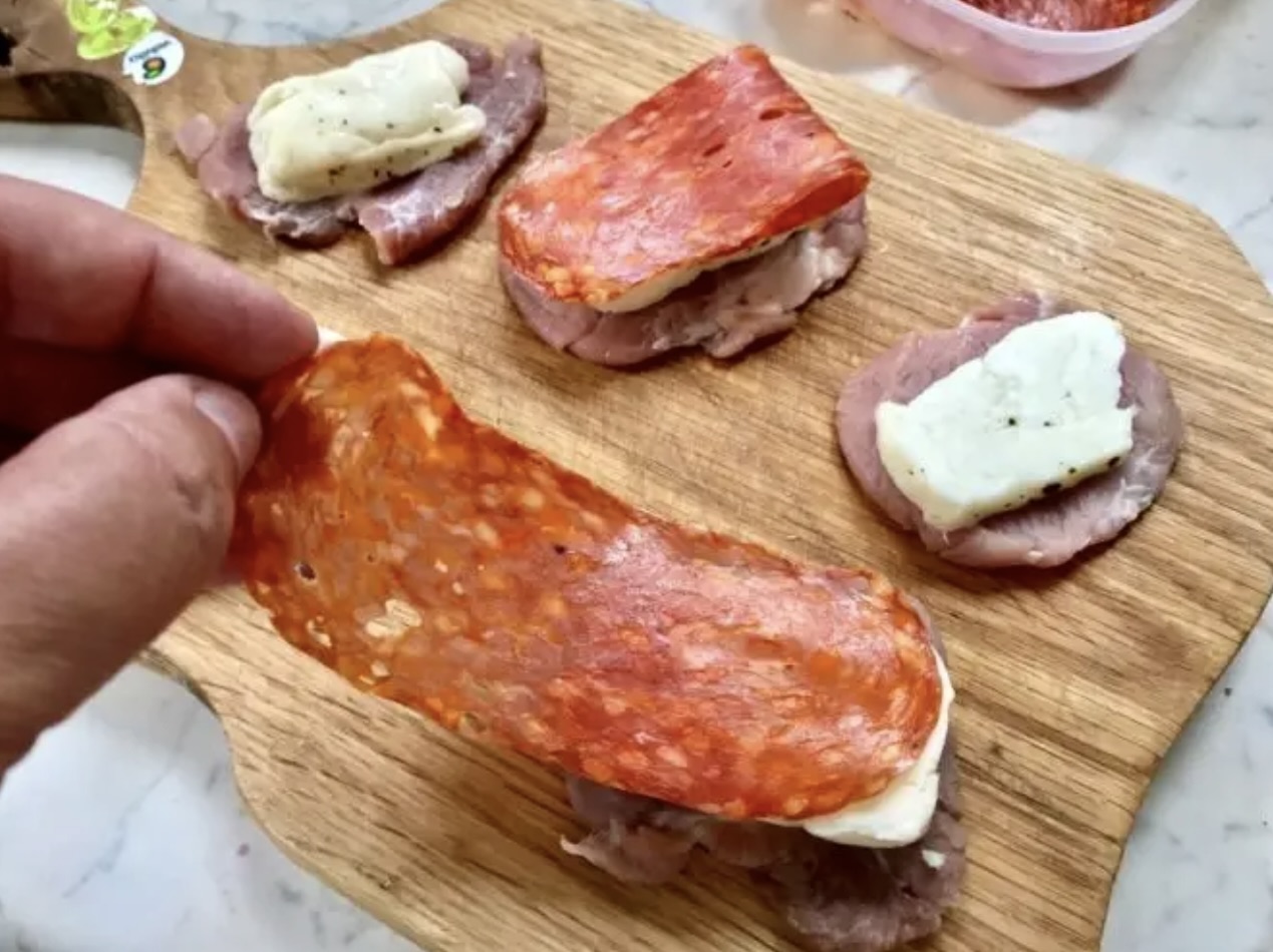Dodanie wędliny: Nałóż po plasterku salami spianato picante na każdy medalion (na ser halloumi).