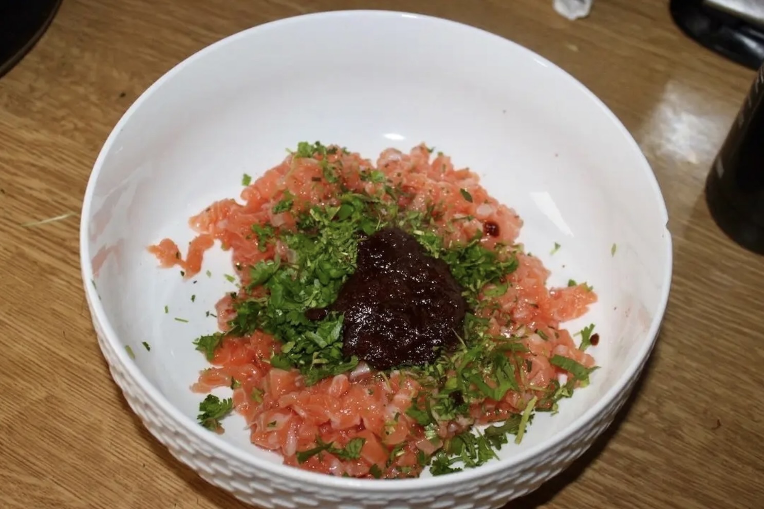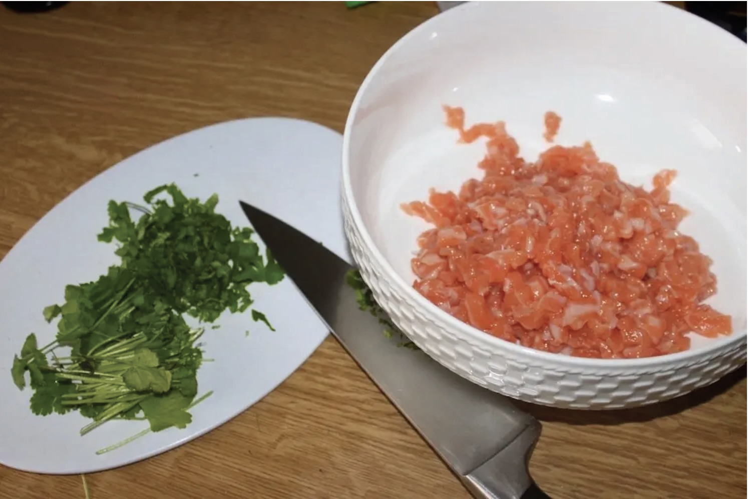 Mięso łososia posiekaj ostrym nożem (zamiast mielenia), co ma poprawić smak potrawy (dowiedz się jak filetować łososia, by potem cieszyć się jego smakiem).