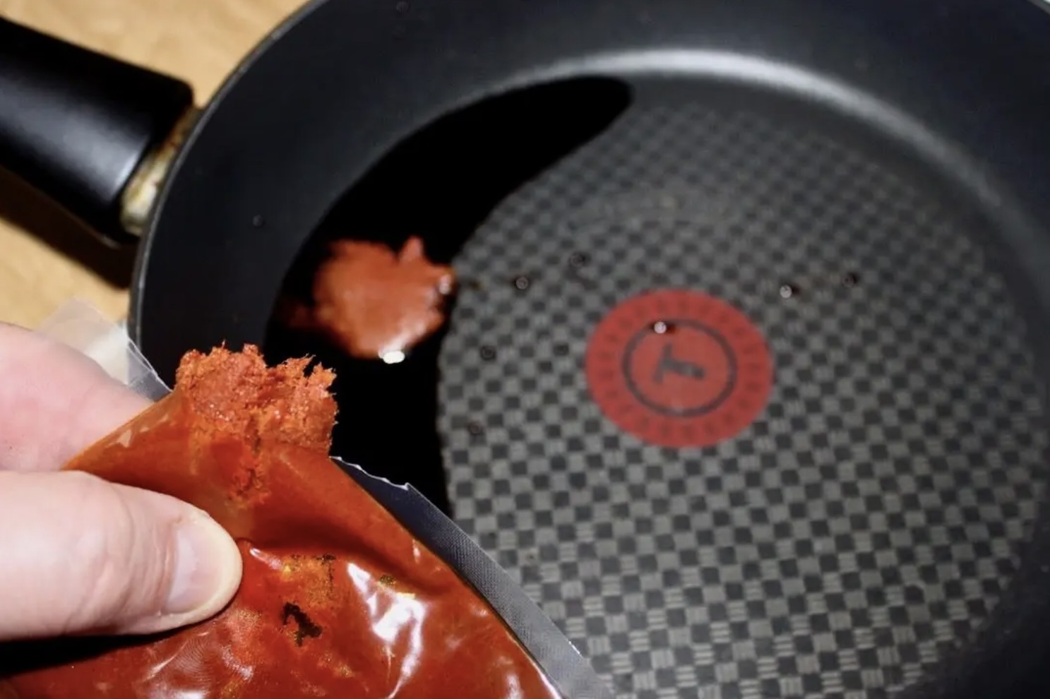 Na małą patelnię wlej 2 łyżki sosu sojowego i dodaj 1 łyżeczkę czerwonej pasty curry. Pasta jest ostra i słona, więc należy uważać, aby nie przesadzić.