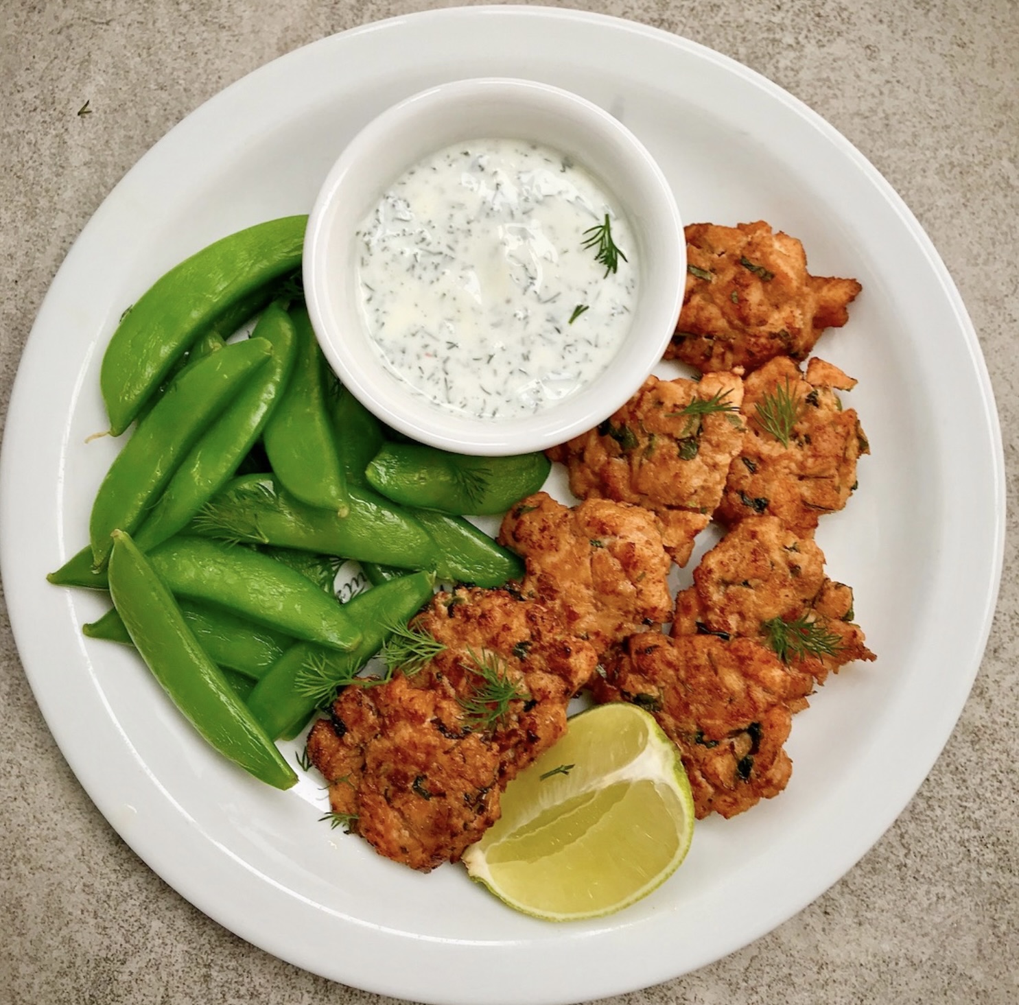 Medaliony z łososia podawaj od razu, np. z gotowanym groszkiem cukrowym i dipem koperkowym z dodatkiem soku z limonki.