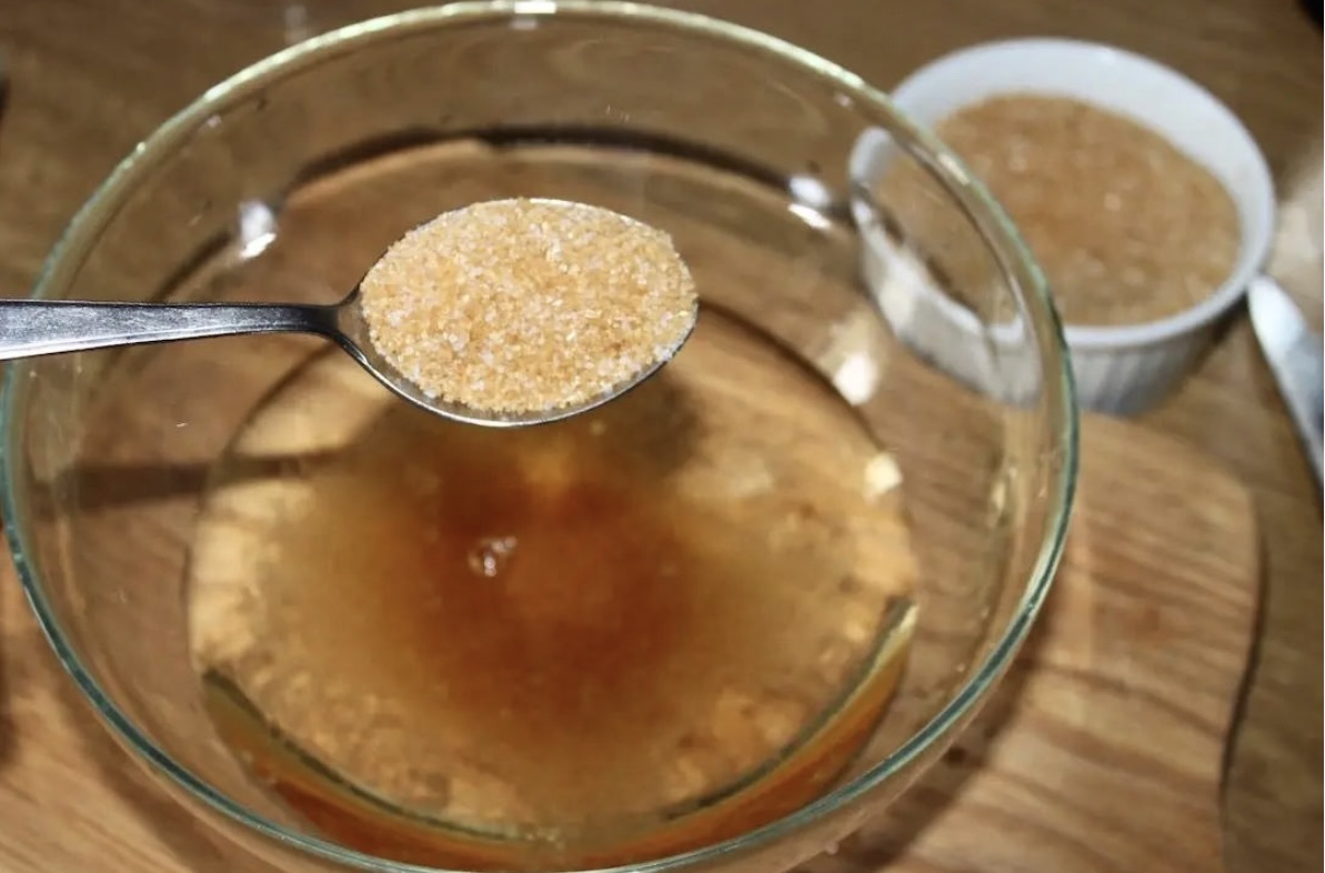 Przygotowanie zalewy: Do nowej miski wlej około 300 ml zimnej wody i wsyp 3 łyżki cukru. Dodaj również około 3 łyżek octu spirytusowego.