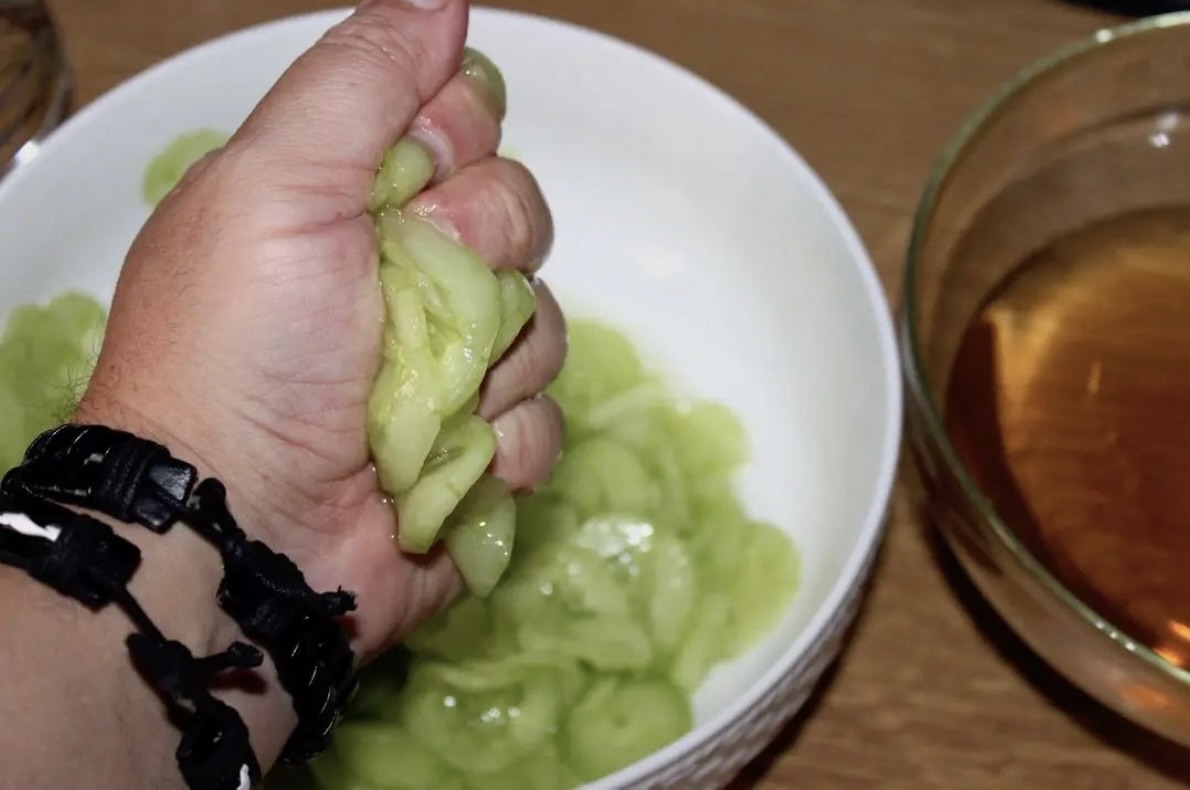 Macerowanie: Delikatnie odciśnij ogórki garściami z nadmiaru wody, która puściły dzięki soli. Przełóż odciśnięte ogórki do zalewy octowej.