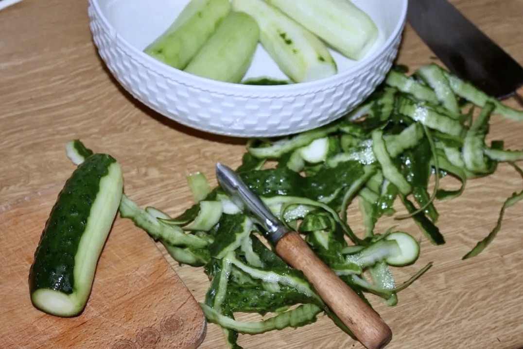 Przygotowanie ogórków: Ogórki obierz ze skóry (jest to warunek, aby mizeria smakowała wybornie, zwłaszcza w przypadku ogórków gruntowych).