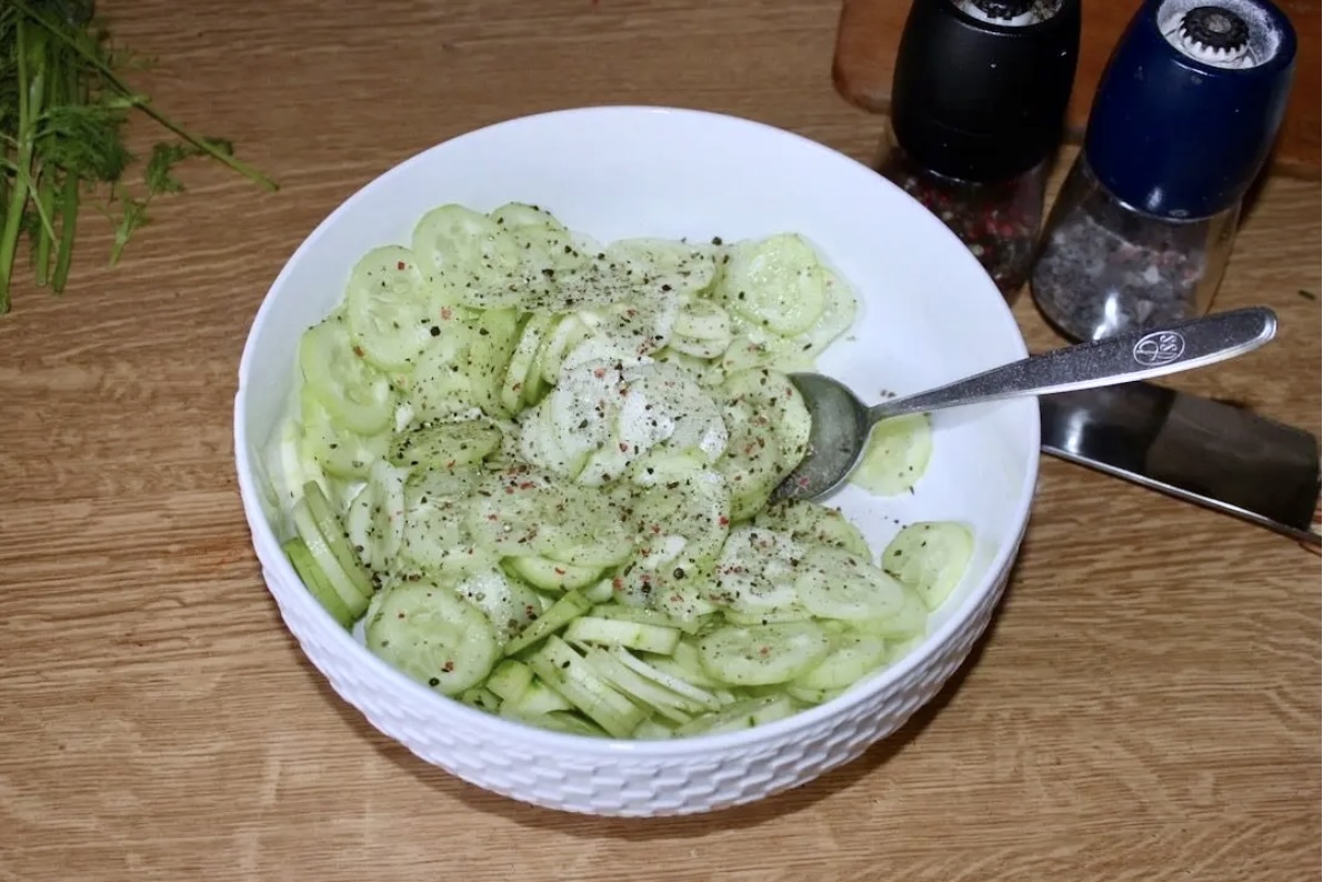 Doprawianie: Pokrojone ogórki przełóż do dużej miski, a następnie posól i posyp świeżo zmielonym pieprzem. Autor przepisu radzi, by nie żałować pieprzu.