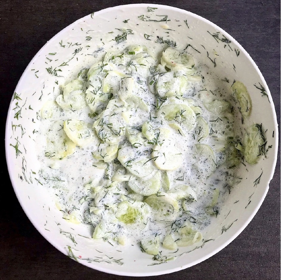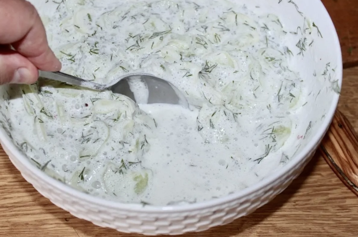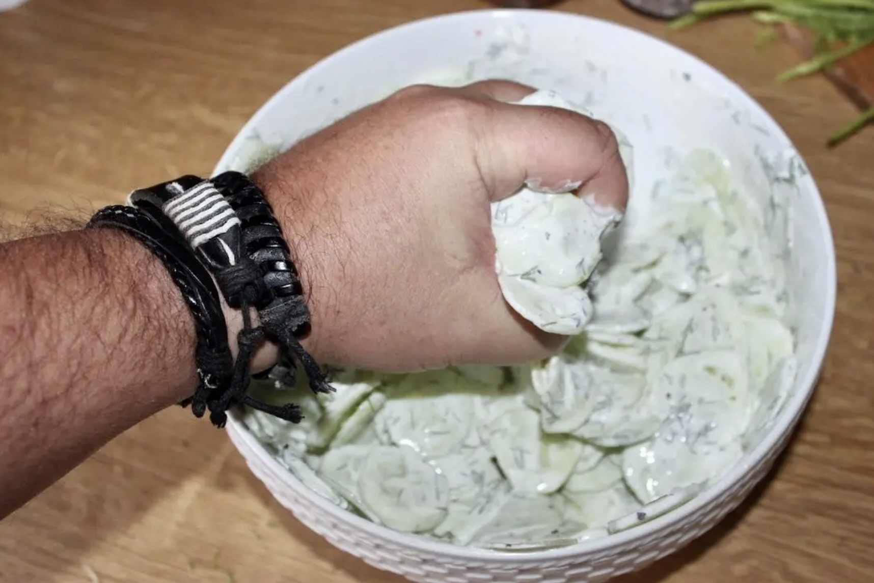 Uwalnianie smaku (tajemna czynność): Ugnieć porządnie kilka razy ogórki w misce, tak aby wypuściły sporo wody. Rób to zdecydowanie, ale z wyczuciem, by ogórki zachowały swój kształt, a nie zamieniły się w papkę. Dzięki temu powstanie dużo sosu śmietanowego.