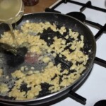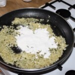 Przygotowanie zasmażki: Na patelni rozgrzej nieco oliwy i masła, a następnie wrzuć cebulę i zeszklij ją. Następnie wsyp 1 lub 2 kopiate łyżki mąki. Dokładnie wymieszaj mąkę z cebulą, a następnie podsmaż na jasnozłoty kolor (tzw. jasna zasmażka).