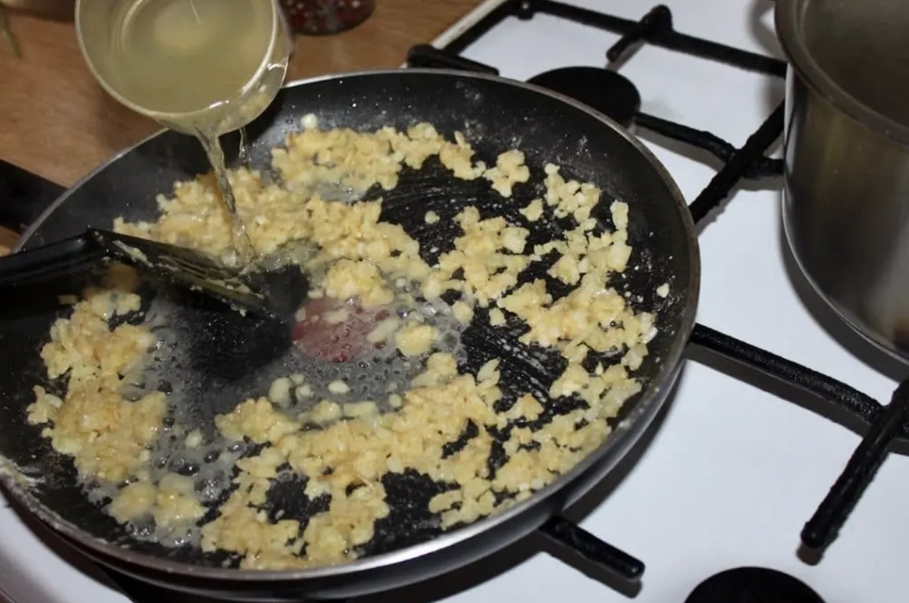 Przygotowanie zasmażki: Na patelni rozgrzej nieco oliwy i masła, a następnie wrzuć cebulę i zeszklij ją. Następnie wsyp 1 lub 2 kopiate łyżki mąki. Dokładnie wymieszaj mąkę z cebulą, a następnie podsmaż na jasnozłoty kolor (tzw. jasna zasmażka).