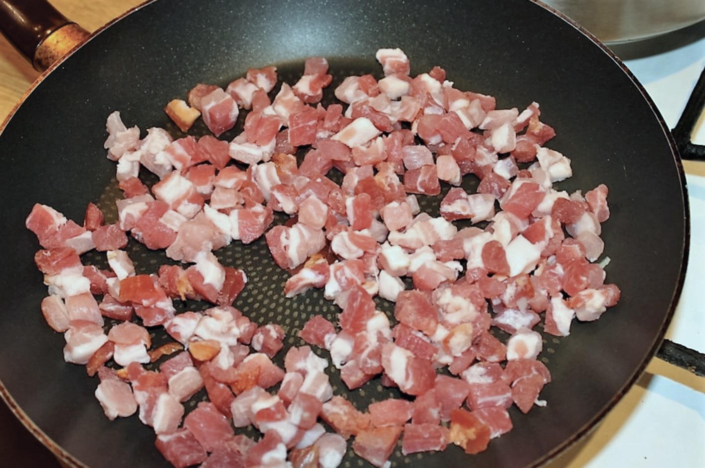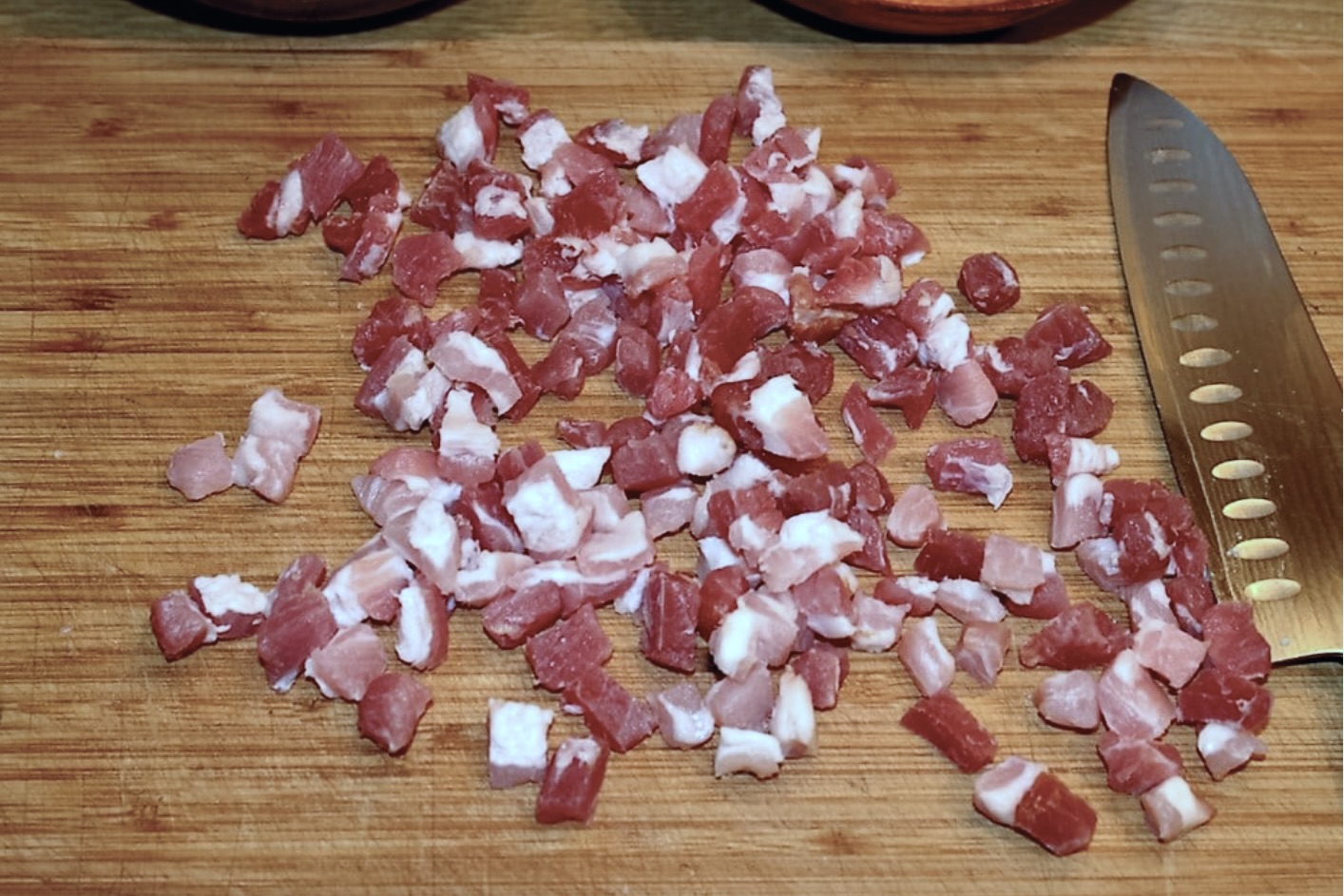 Przygotowanie Dodatków: Boczek pokrój w dość drobną kostkę. Cebulę również posiekaj w drobną kostkę.