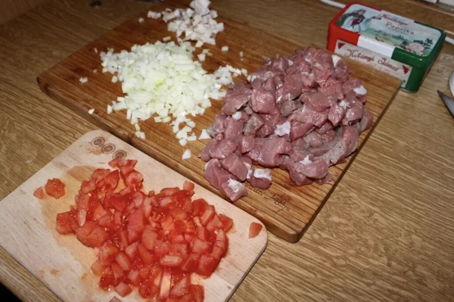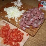 Pokrój mięso w drobną kostkę. Posiekaj drobno słoninę i cebulę. Pomidora sparz, obierz ze skóry i również posiekaj w kostkę.