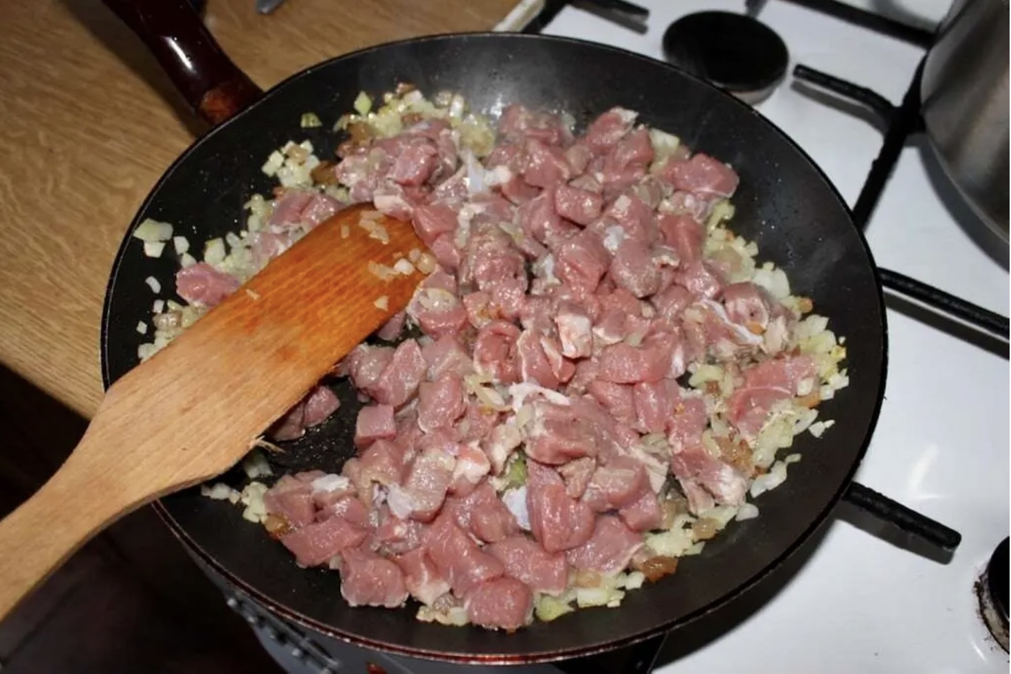 Włóż mięso na patelnię i smaż na mocnym ogniu, aby lekko się zrumieniło (unikaj przesmażenia).