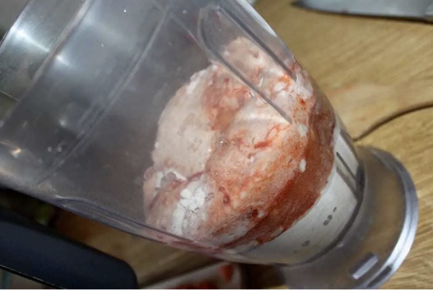 Posiekane mięso przypraw solą, pieprzem i łyżką kwaśnej śmietany, tak aby farsz był zwarty i kleisty.