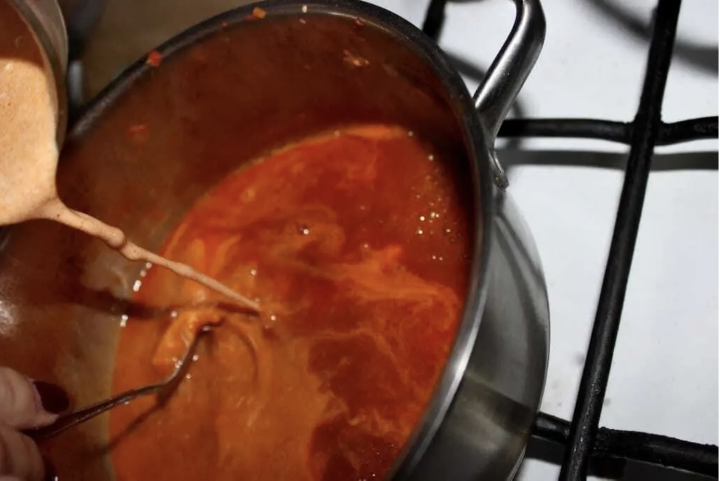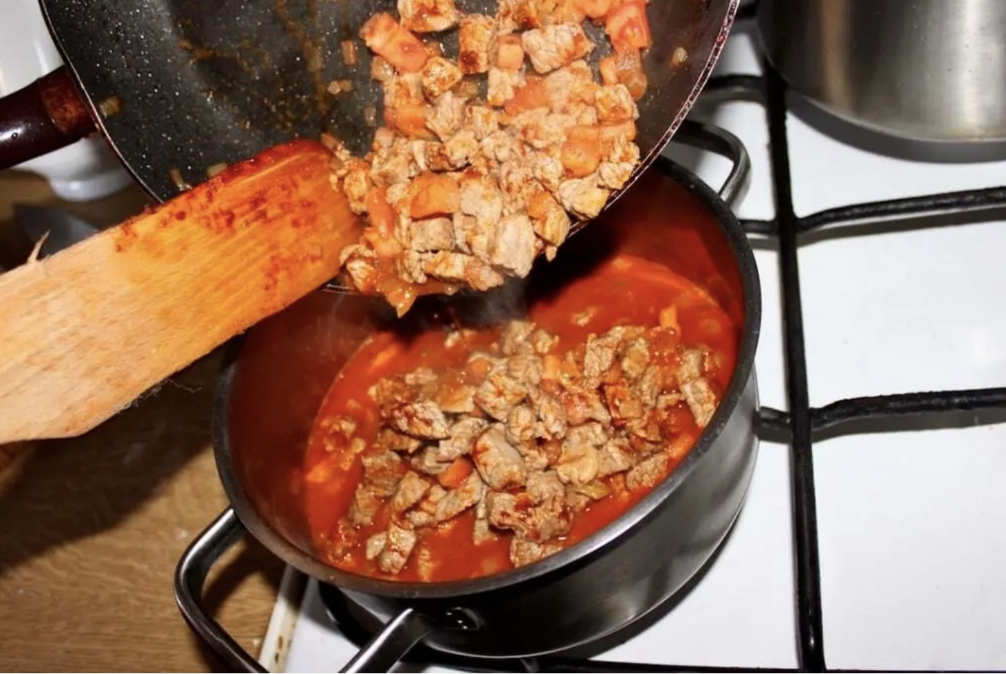 Dodaj posiekanego pomidora. Całość zalej wrzątkiem w takiej ilości, aby po dokładnym wymieszaniu powstał gładki sos z mięsem.