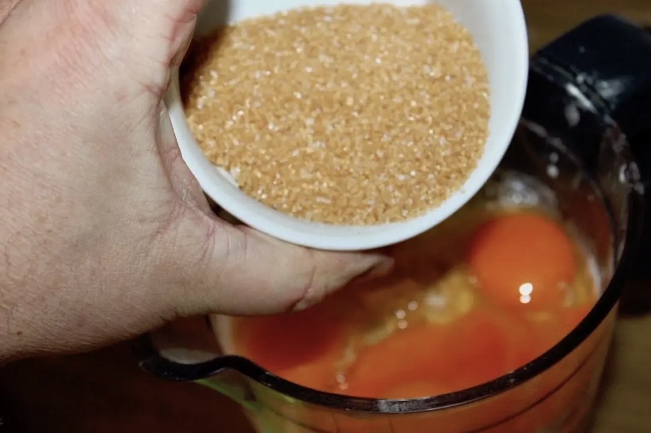 1. Ciasto: Przesiej mąkę, a następnie wsyp ją do miski lub malaksera. Wlej mleko, wbij jajka, dodaj cukier, sól i kurkumę.