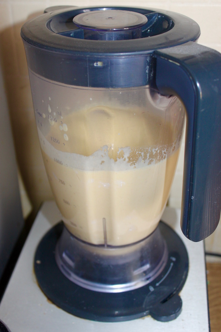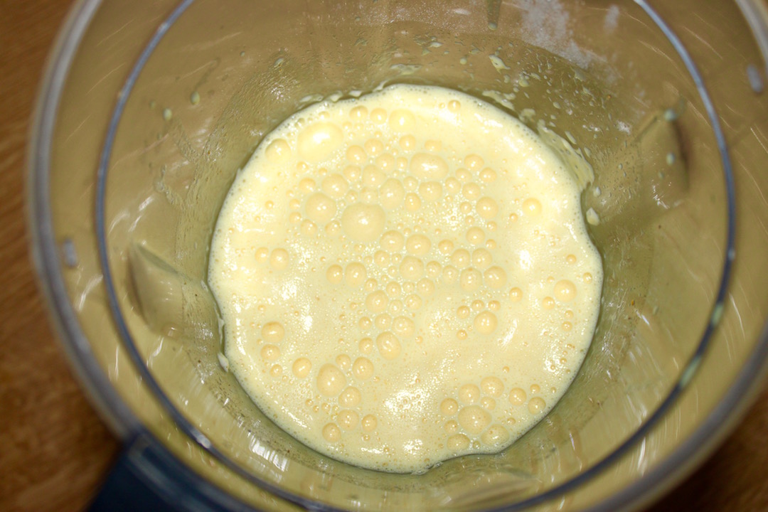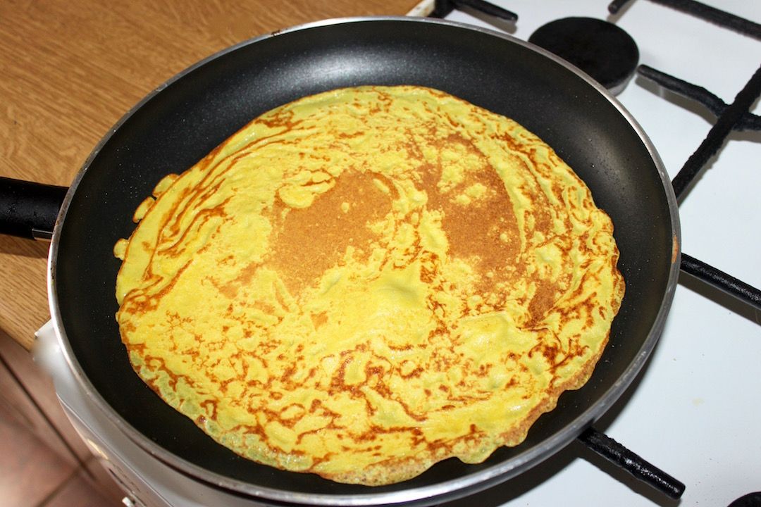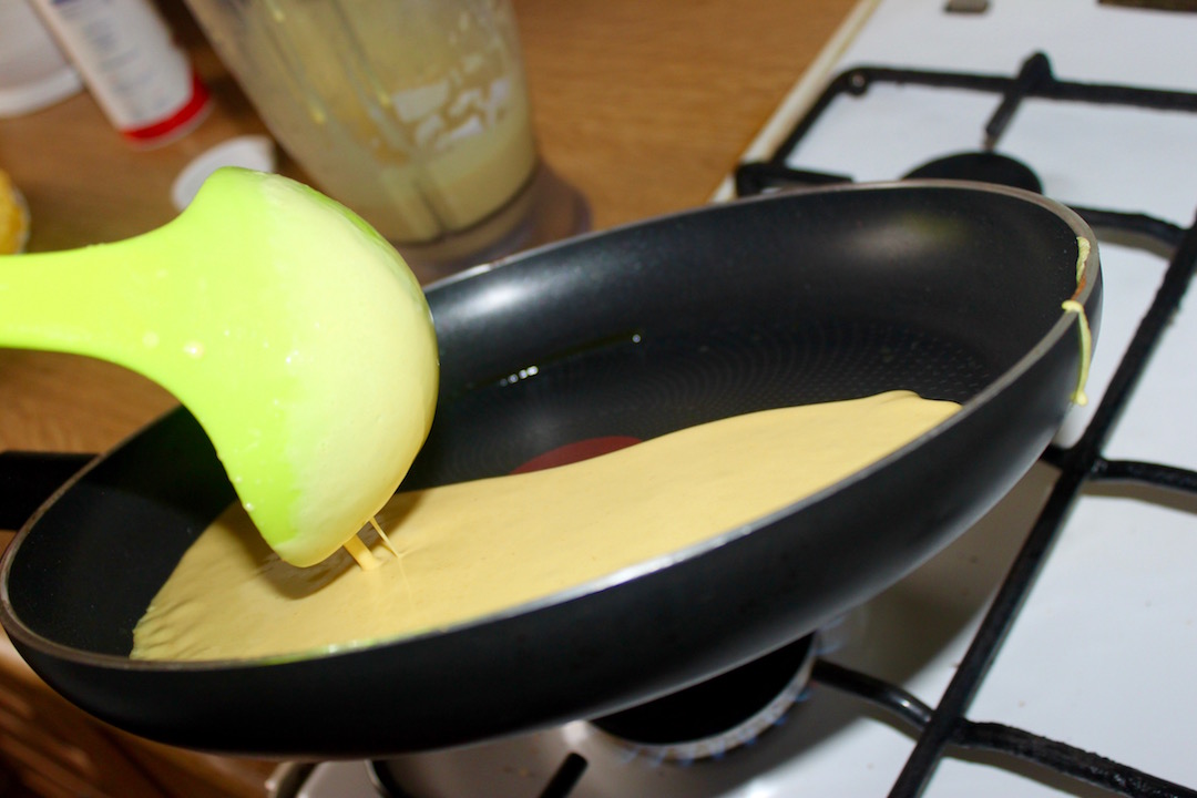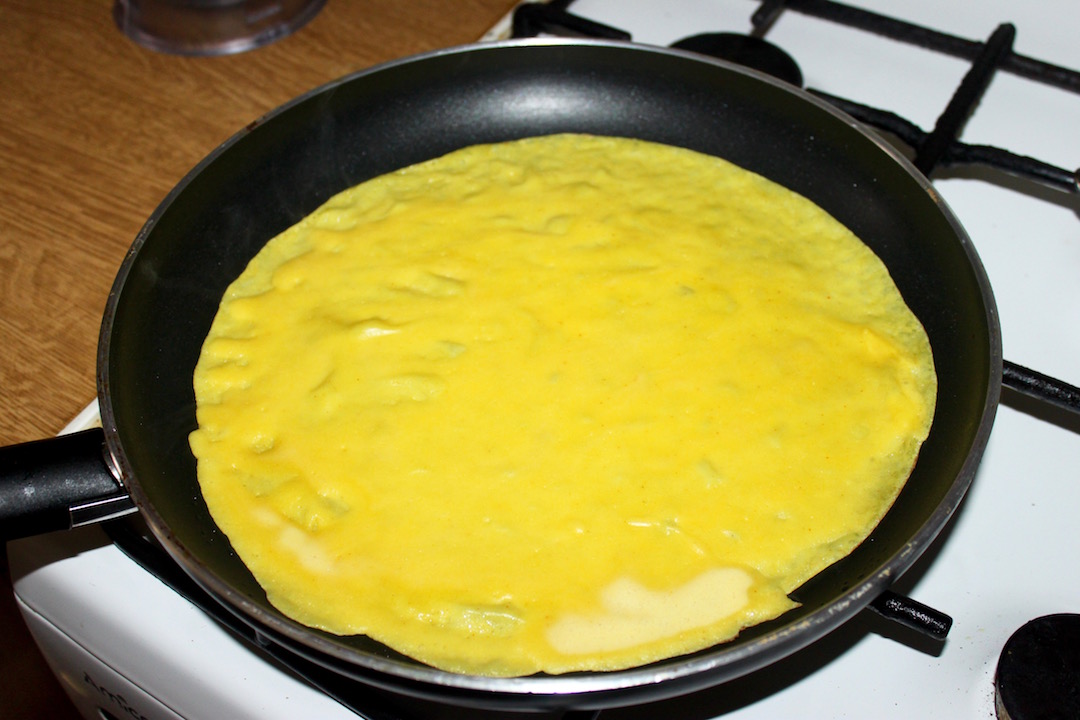 Ciasto: Wymieszać w misce mleko, mąkę, sól, cukier, kurkumę i jajka, aż do uzyskania lekko lejącej konsystencji.