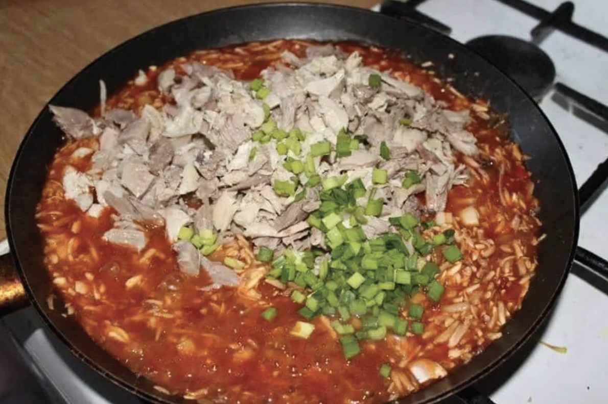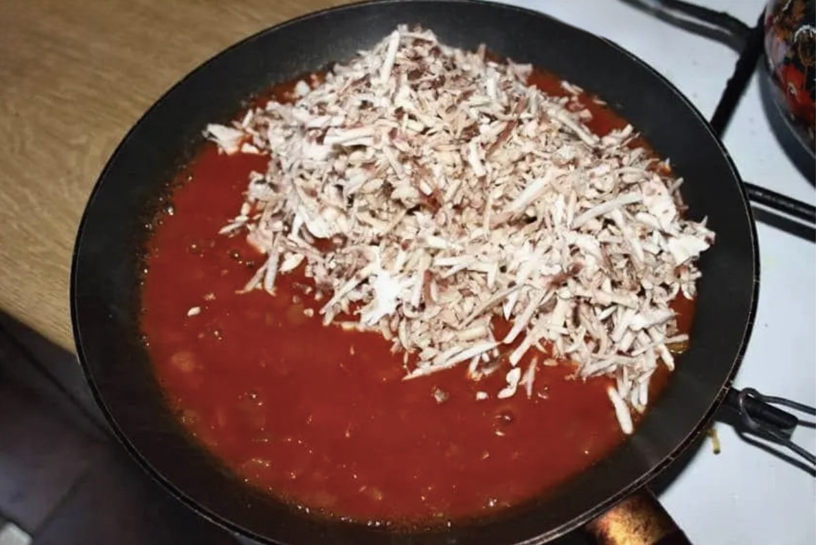 Ugotowane mięso z kurczaka (z rosołu lub wywaru drobiowego) oddziel od kości, drobno posiekaj i przełóż do miski. Powinno go być około 200-250 gramów.