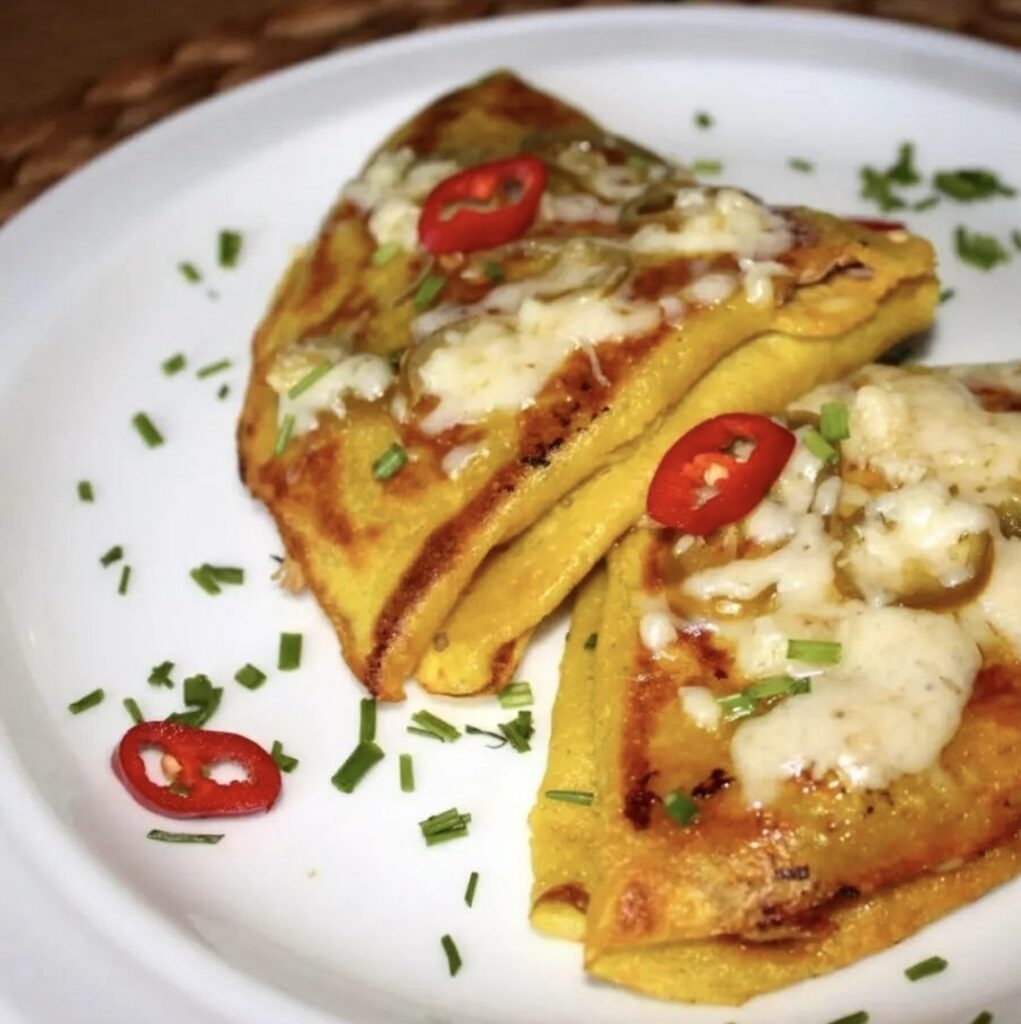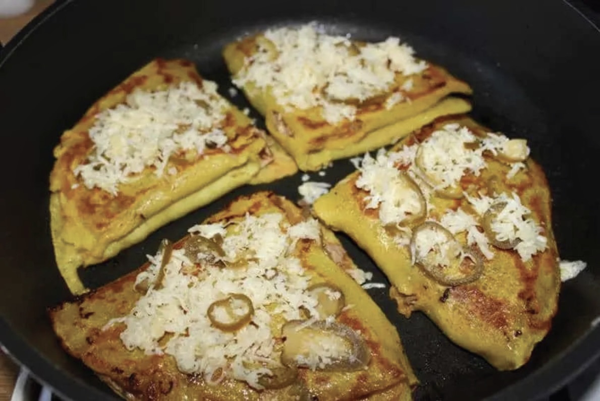 Następnie odwróć je na drugą, posyp mieszaniną startego żółtego sera, czosnku i jalapeno.