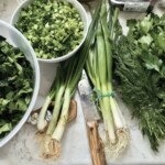 W kolejnym naczyniu umieść posiekany koperek, zieloną część dymki (nie za dużo), natkę pietruszki, a także miętę.