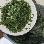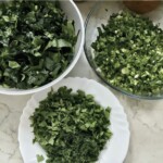 Farsz końcowy: Jeszcze raz porządnie odciśnij nieco przestudzone zioła. Przełóż je do miski i dodaj twaróg. Całość dopraw i dobrze wymieszaj rękami, aby powstała prawie idealnie gładka masa.