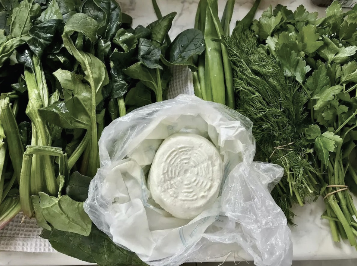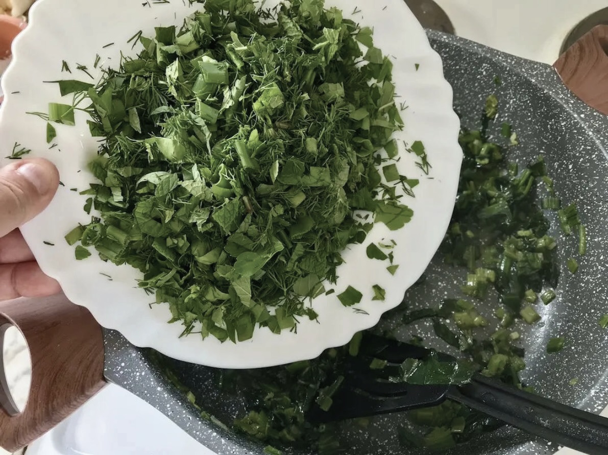 Farsz końcowy: Jeszcze raz porządnie odciśnij nieco przestudzone zioła. Przełóż je do miski i dodaj twaróg. Całość dopraw i dobrze wymieszaj rękami, aby powstała prawie idealnie gładka masa.