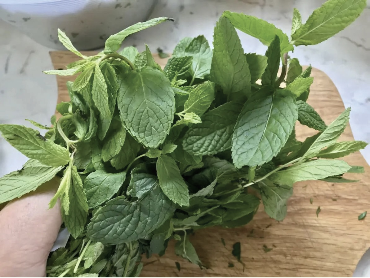 W kolejnym naczyniu umieść posiekany koperek, zieloną część dymki (nie za dużo), natkę pietruszki, a także miętę.